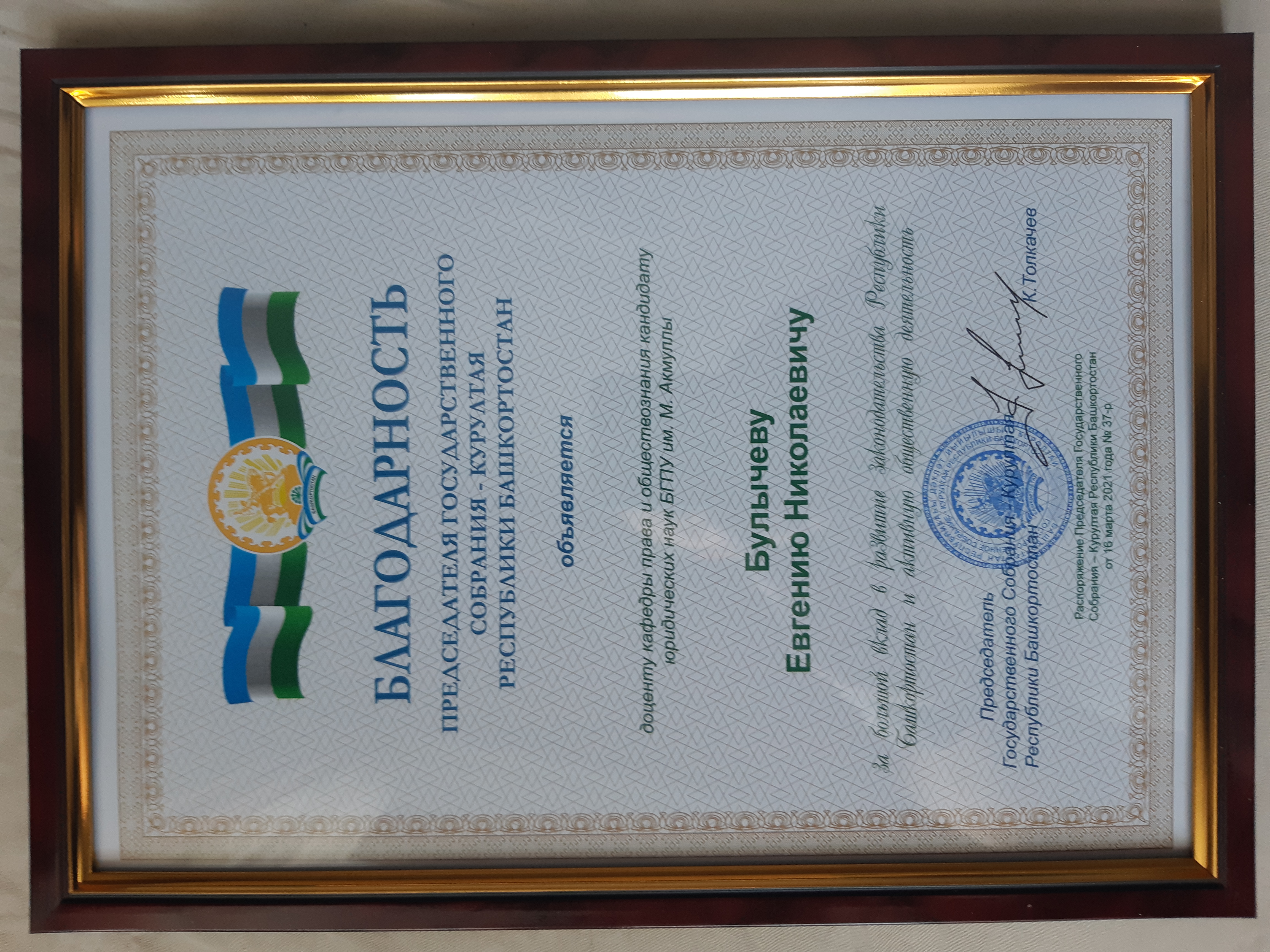 По завершении данного мероприятия сотруднику нашего Университета Булычеву Евгению Николаевичу была вручена Благодарность Председателя Государственного Собрания – Курултая Республики Башкортостан «за большой вклад в развитие Законодательства Республики Башкортостан и активную общественную деятельность».