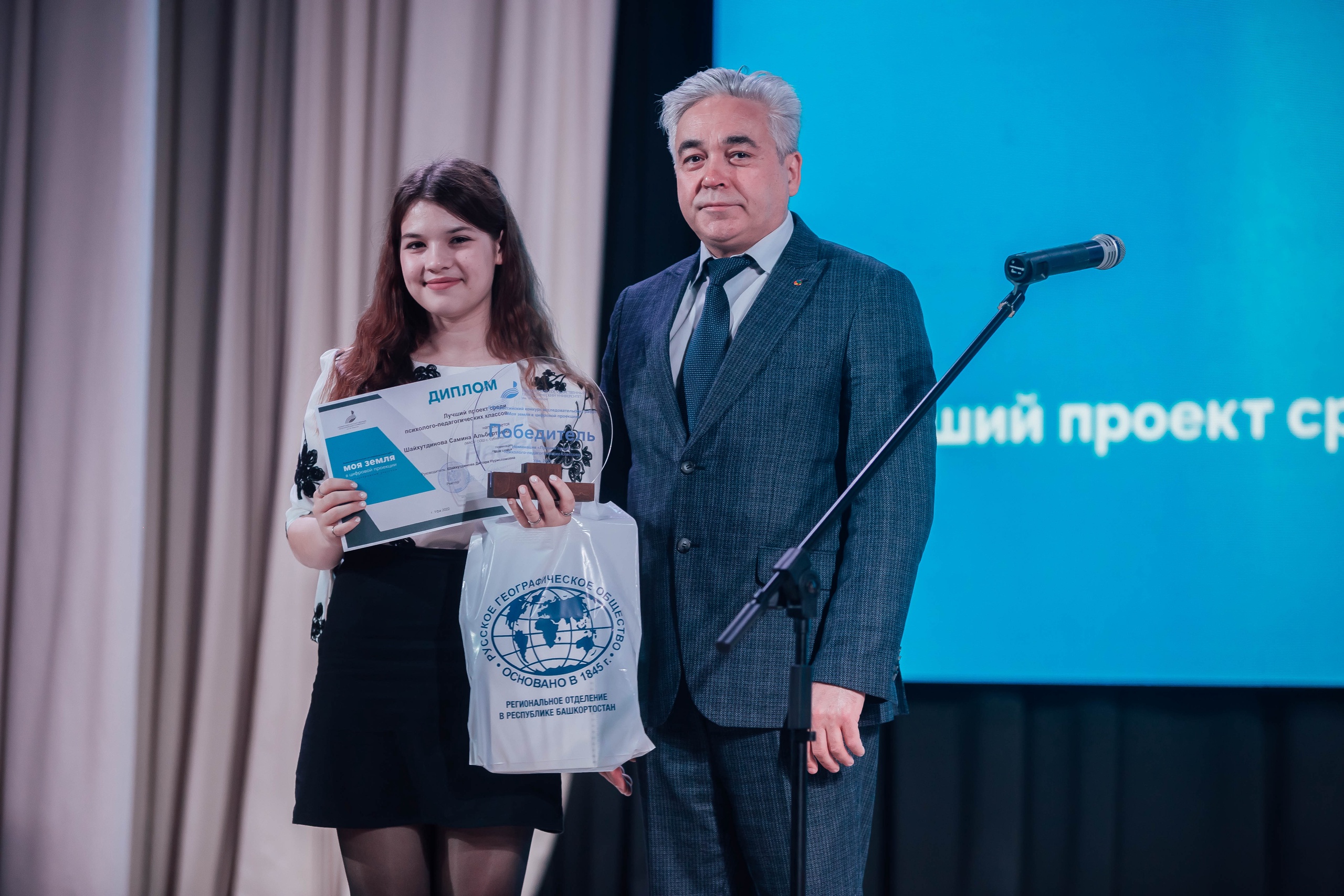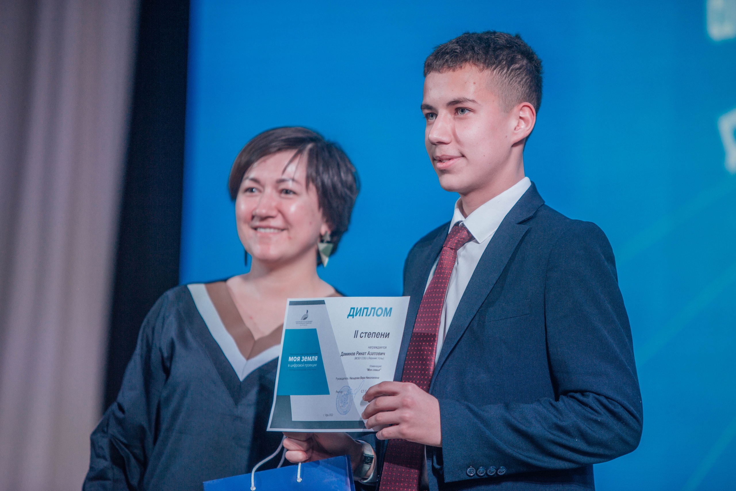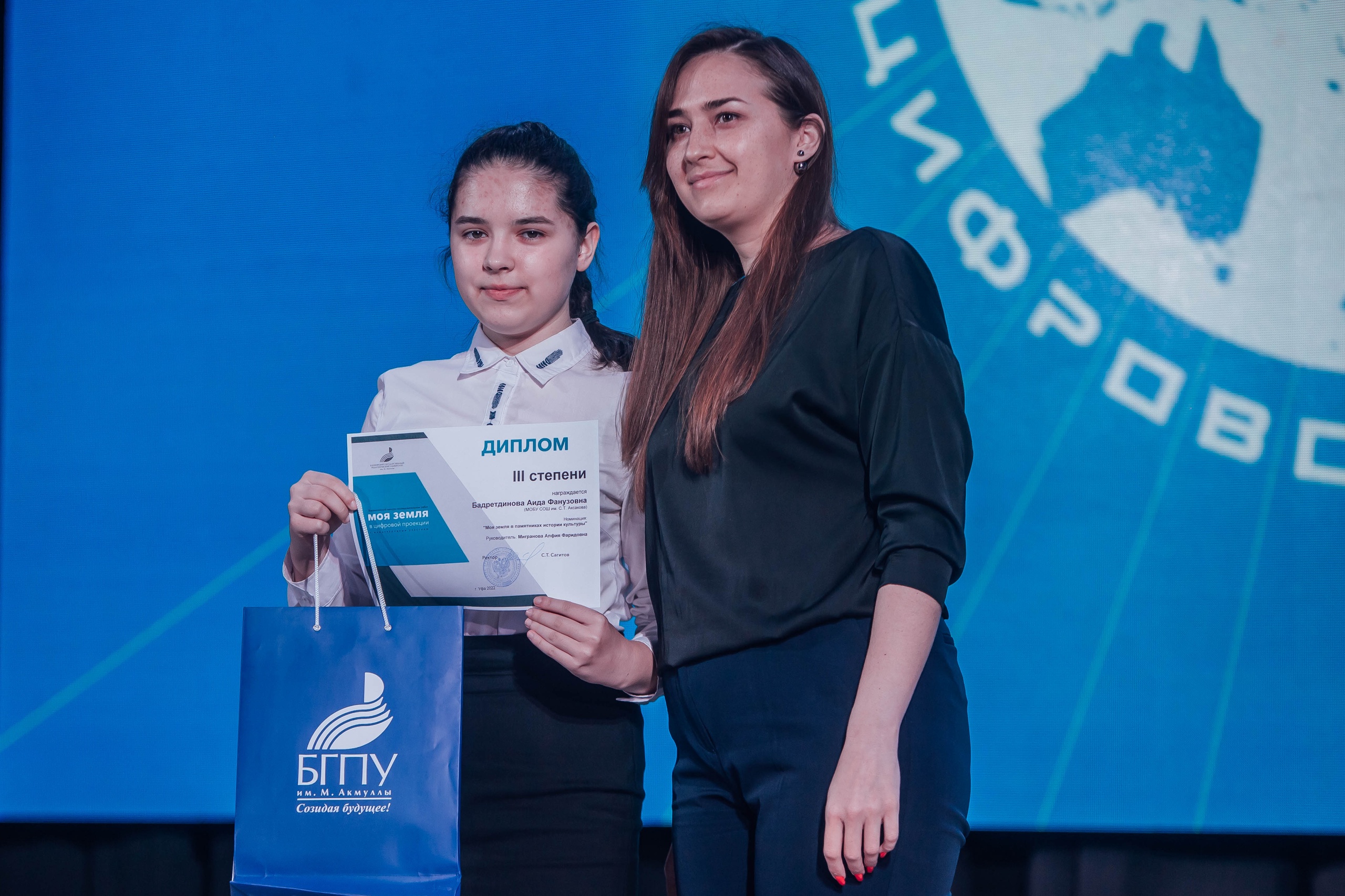 27 апреля 2022 года в концертном зале второго учебного корпуса Башкирского государственного педагогического университета им. М. Акмуллы состоялась торжественная церемония награждения победителей II Всероссийского конкурса исследовательских работ «Моя земля в цифровой проекции». Мероприятие прошло в рамках Евразийского молодёжного форума «Образование. Наука. Карьера».