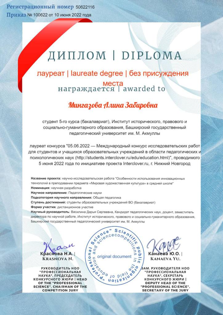 5 июня 2022 г. были подведены итоги Международного конкурса исследовательских работ для студентов и учащихся образовательных учреждений в области педагогических и психологических наук. Конкурс проходил в г. Нижний Новгород по инициативе проекта Interclover. Студентка кафедры культурологии и социально-экономических дисциплин Институт исторического, правового и социально-гуманитарного образования БГПУ им.М.Акмуллы Алина Мингазова предоставила на конкурс научно-исследовательскую работу «Особенности использования инновационных технологий в преподавании предмета «Мировая художественная культура» в средней школе» (руководитель Д.С. Василина).