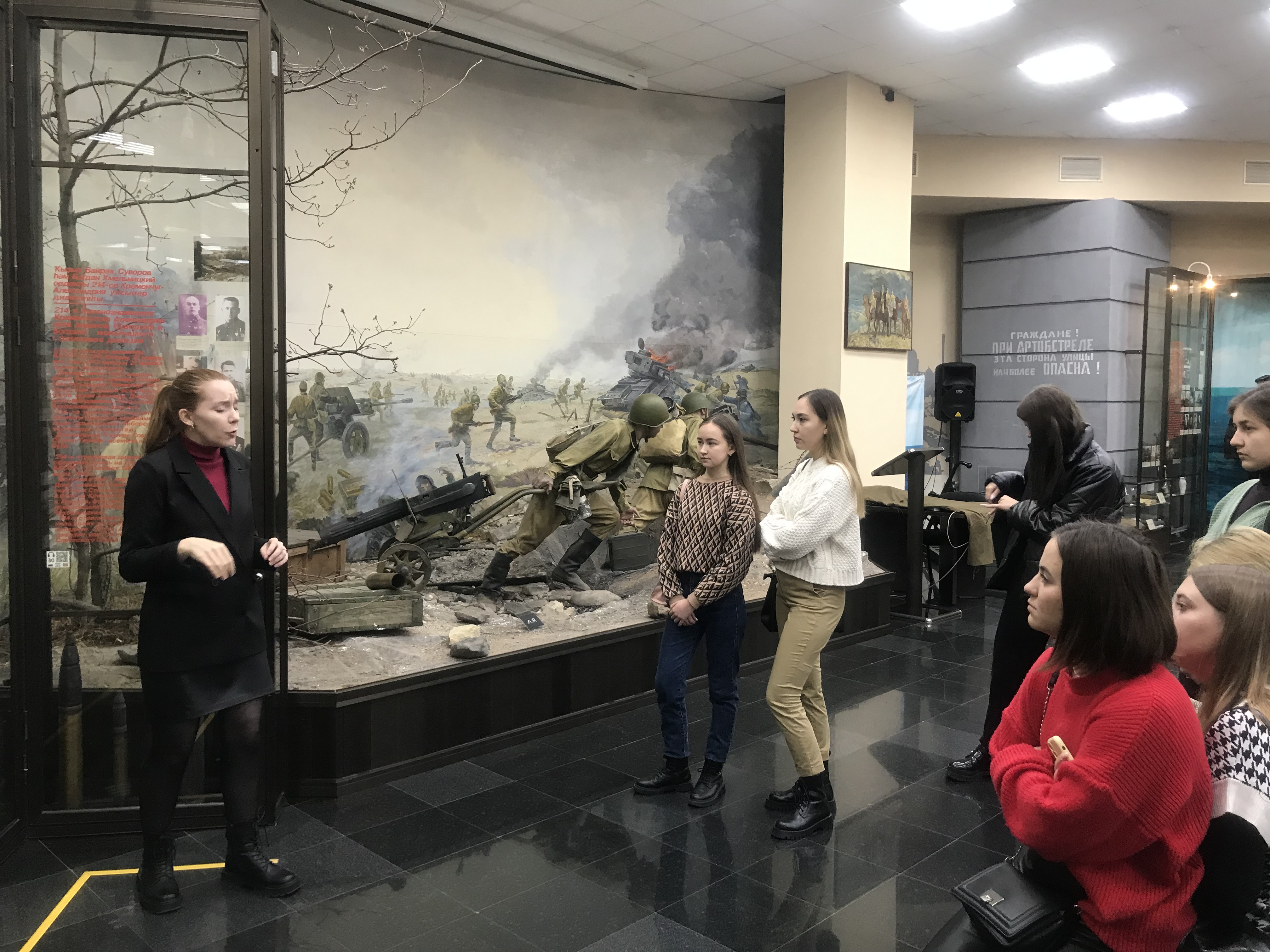 В Музее Боевой Славы практиканты познакомились с военно-исторической экспозицией, которая размещается по периметру огромного здания: вооружение, обмундирование, документы, личные вещи советских бойцов и трофейные материалы, в музее отображено партизанское движение на оккупированных территориях, эвакуация предприятий, работа тыла, подвиги наших знаменитых земляков. Основной упор был сделан на воспитательном потенциале экспозиции.