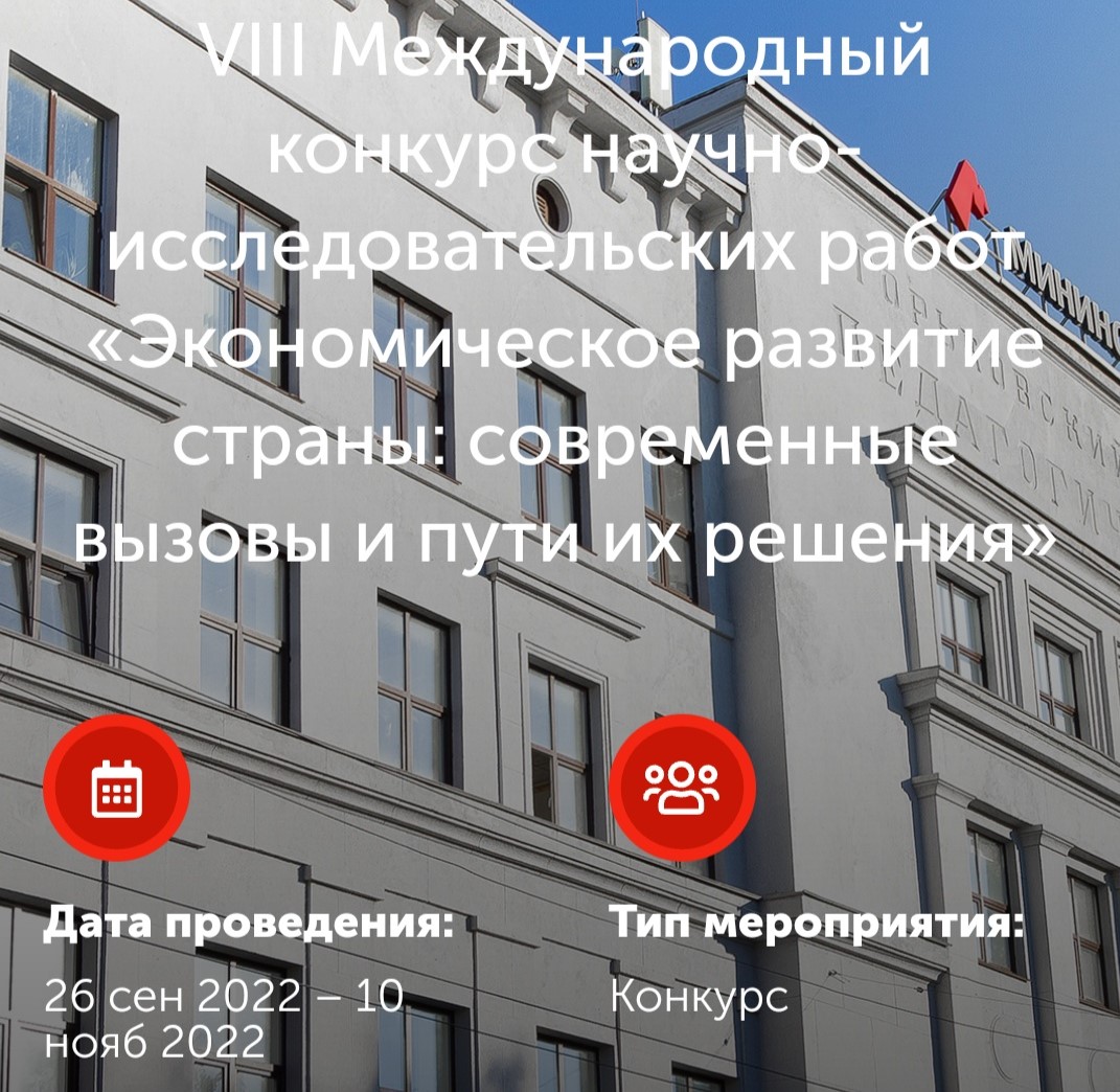 Состоялся VIII Международный конкурс научно-исследовательских работ студентов, магистрантов, аспирантов «Экономическое развитие страны: современные вызовы и пути их решения», в рамках XХ Юбилейной Международной научно-практической конференции преподавателей вузов, ученых, специалистов, аспирантов, студентов: «Промышленное развитие России: проблемы, перспективы», посвященной памяти доктора экономических наук, профессора Белоусова Рэма Александровича. Студентка 4 курса Алина Хаматдинова получила Диплом III степени в номинации "Эссе" Секции 5. Роль трудовых ресурсов в развитии промышленных предприятий. Научный руководитель - доцент Н.Е. Хабибова.