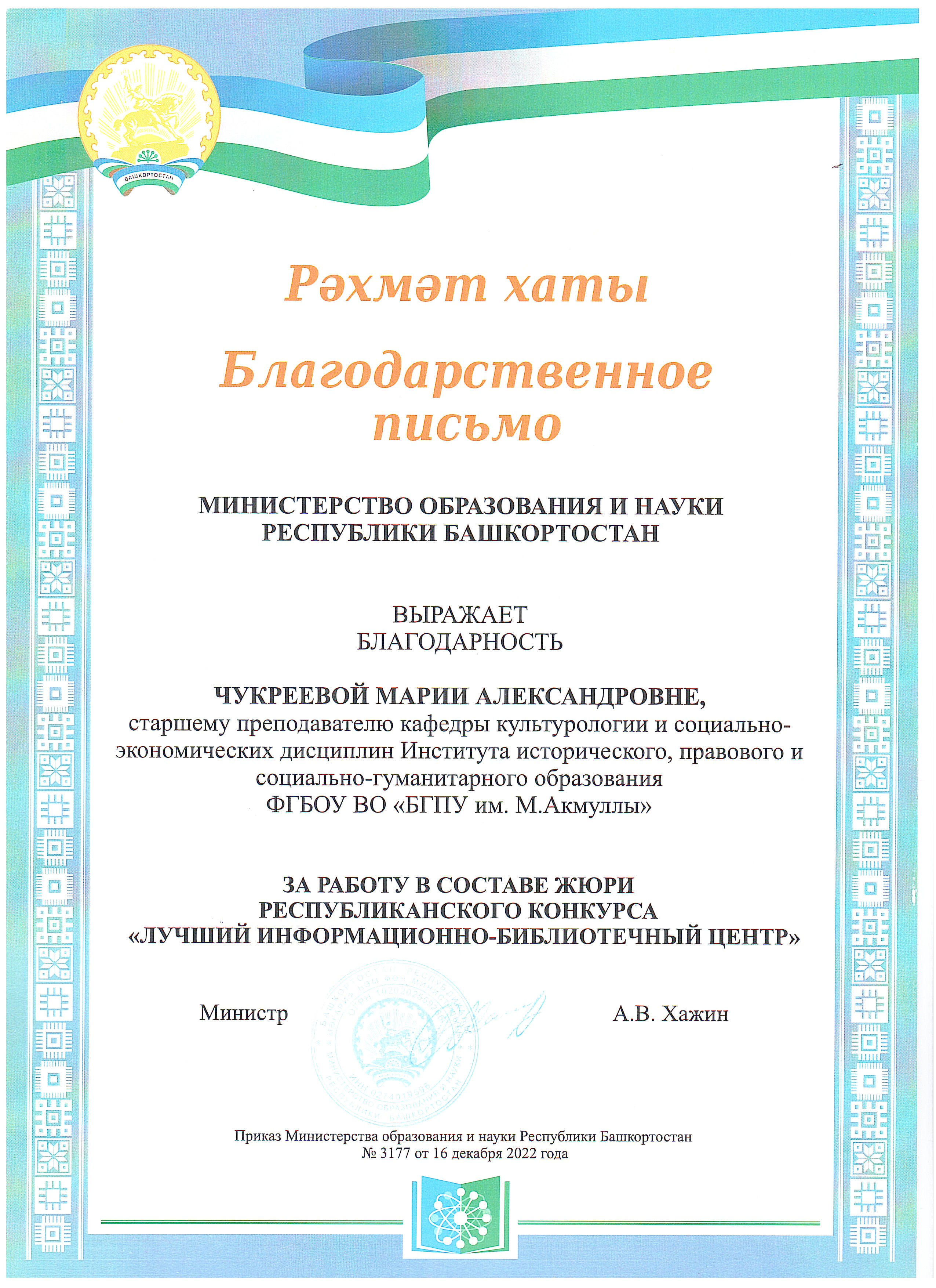 Старший преподаватель М.А. Чукреева награждена благодарственным письмом Министерства образования и науки Республики Башкортостан за активную работу в составе жюри республиканского конкурса "Лучший информационно-библиотечный центр". Сотрудники Управления национального образования отметили высокое качество работы старшего преподавателя М.А. Чукреевой и выразили надежду на дальнейшее сотрудничество в рамках данного республиканского конкурса. Церемония награждения проходила в актовом зале Республиканской полилингвальной многопрофильной гимназии №1.