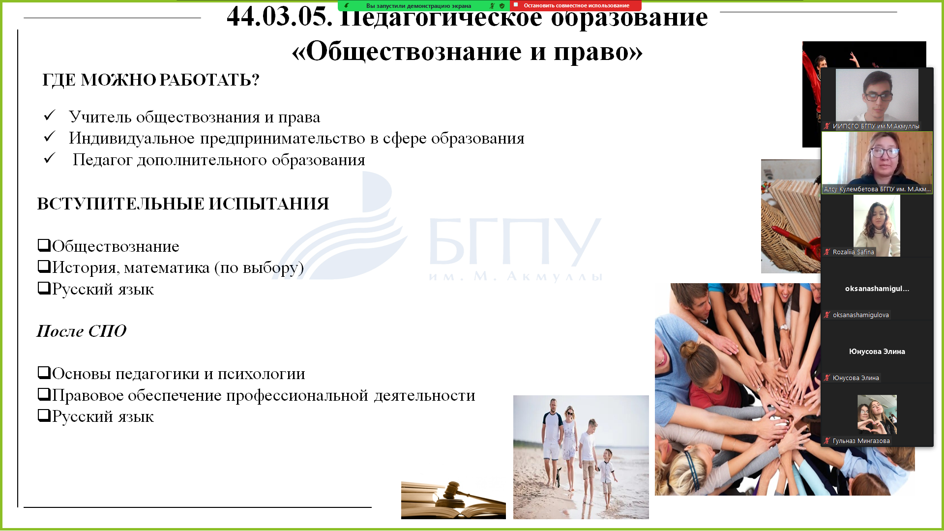 14 января 2023 года в Институте исторического, правого и социально-гуманитарного образования состоялась онлайн встреча с будущими абитуриентами в рамках Дня открытых дверей БГПУ им. М. Акмуллы. Представители администрации Института и студенческого самоуправления помогли абитуриентам узнать об Институте, разобраться в траектории поступления и определиться с направлением обучения.