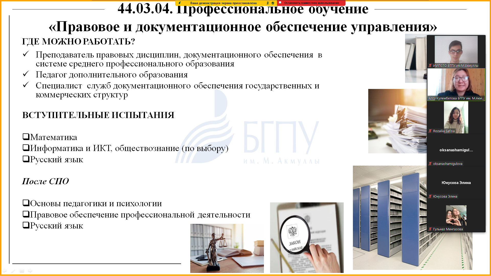 Общие сведения о направлениях подготовки, специфике обучения в Акмуллинском университете дали директор Института исторического, правого и социально-гуманитарного образования О.А.Шамигулова, представители студенческого актива А.Кулембетова и Р.Сафина.