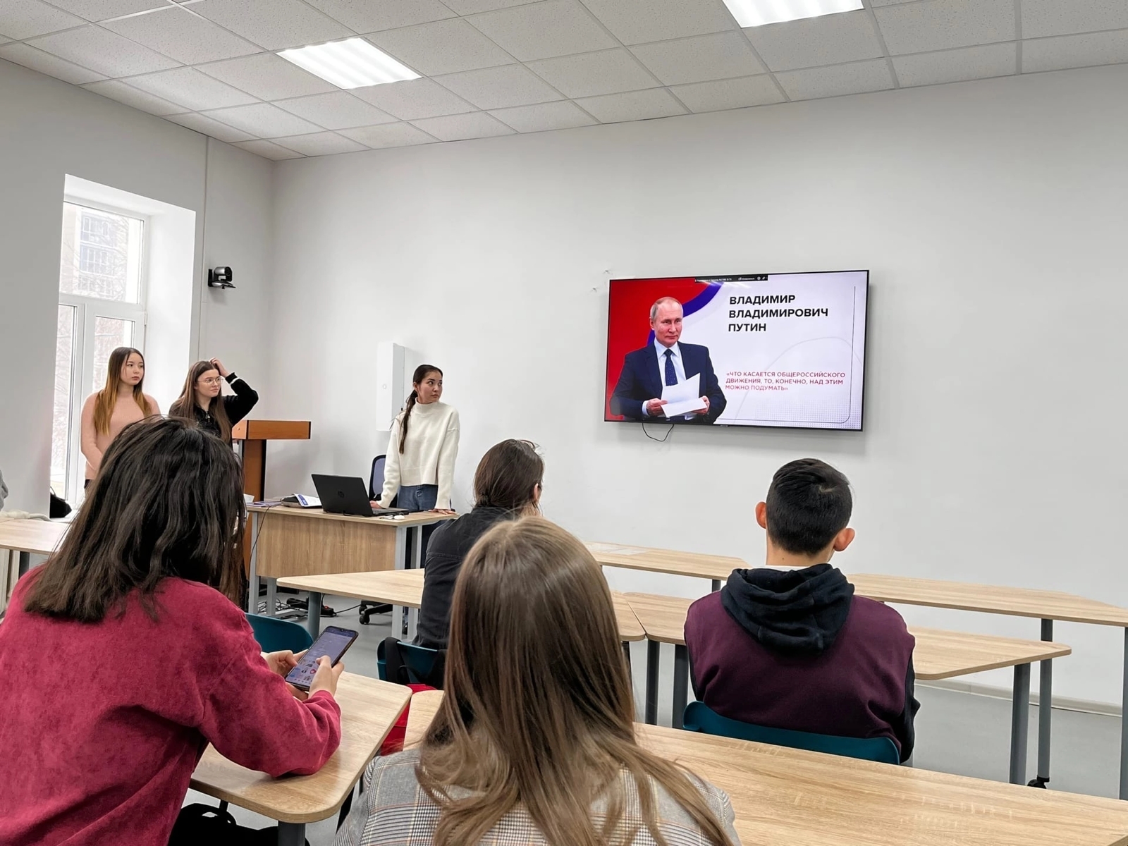 В рамках проведенного классного часа, студентам продемонстрировали обращение руководителя Российского движения детей и молодежи «Движение первых» Григория Гурова, который определил уникальные возможности, участников движения -  бесценный опыт общения со сверстниками, положительные эмоции, уверенные шаги во взрослую жизнь. Первокурсники познакомились с миссией, ценностями и основными направлениями деятельности Российского движения детей и молодежи «Движение первых», обсудили наиболее приоритетные ценности в рамках будущей профессии, среди которых –человечность, доброта, сохранение исторической памяти,  а также составили карту движения в соответствии с поставленными целями, в рамках направлений деятельности «Движение первых».