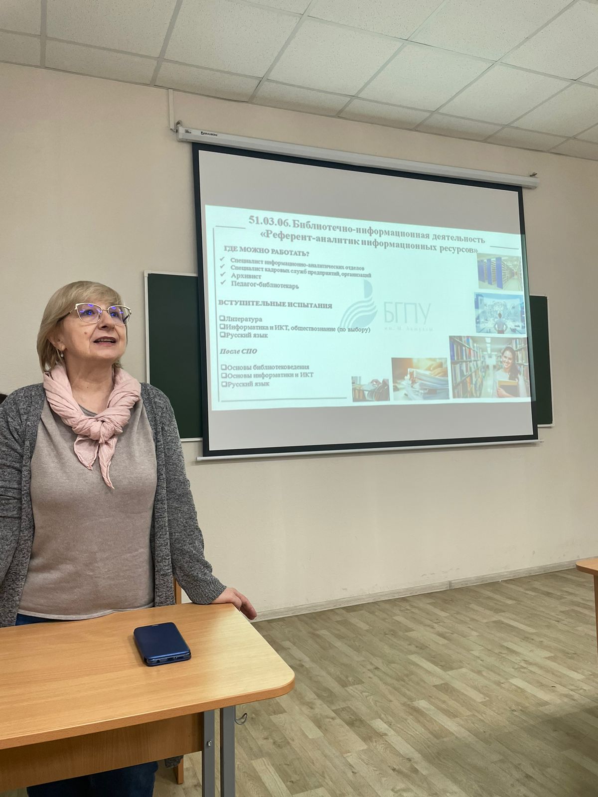 Р.А. Гильмиянова более подробно остановилась на тех вступительных испытаниях, которые предусмотрены в рамках программы «Референт-аналитик информационных ресурсов», реализуемой по направлению подготовки 51.03.06 «Библиотечно-информационная деятельность». К ним относятся «Русский язык», «Основы информатики и ИКТ», «Основы библиотековедения» Были раскрыты содержание программы и показаны возможности трудоустройства выпускников – это все сферы профессиональной деятельности, связанные с информационной аналитикой.