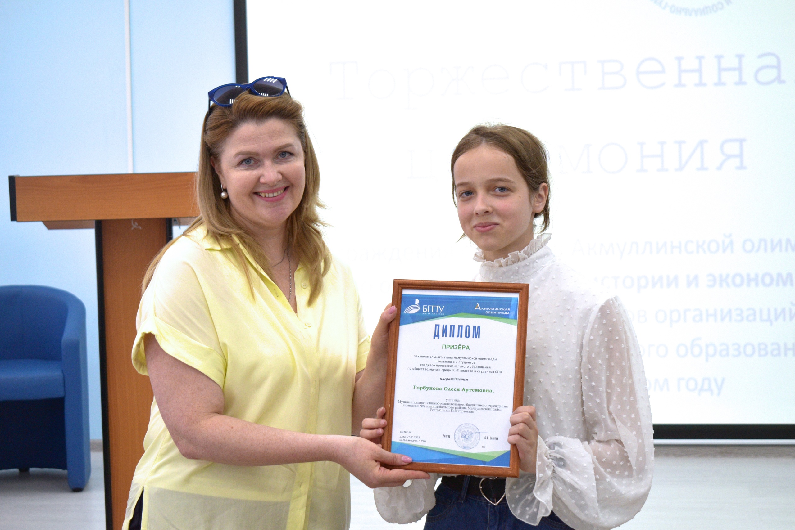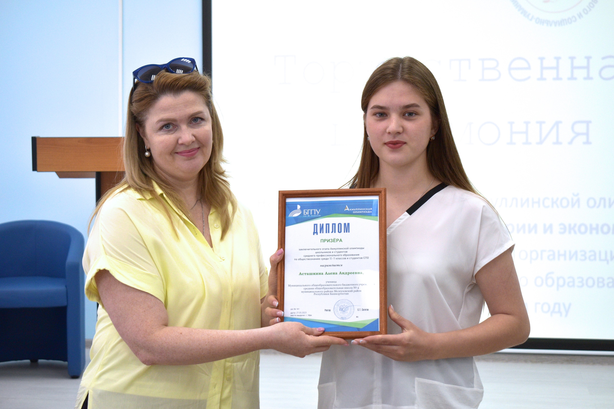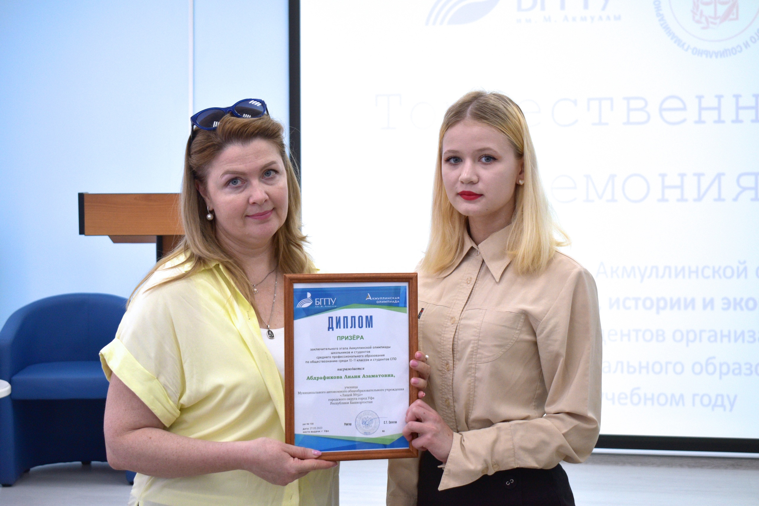 27 мая 2023 года на площадке Института исторического, правового и социально-гуманитарного образования БГПУ им. М. Акмуллы состоялось торжественное награждение призеров Акмуллинской олимпиады по истории, обществознанию и экономике. Олимпиада школьников 8-11 классов и студентов СПО России проводилась в десятый раз. Всего призерами стали 32 человека, в том числе учащиеся психолого-педагогических классов БГПУ им.М.Акмуллы. С приветственным словом к участникам мероприятия обратилась директор ИИПСГО Оксана Шамигулова, отметившая актуальность гуманитарного образования в настоящее время. В рамках мероприятия ребята познакомились с направлениями деятельности и подготовки Института. При посещении социально-гуманитарного кластера технопарка обучающиеся смогли в неформальной обстановке задать вопросы преподавателям и студентам Института, а также погрузиться в виртуальную программу Полтавской битвы, эпохи Екатерины Великой.