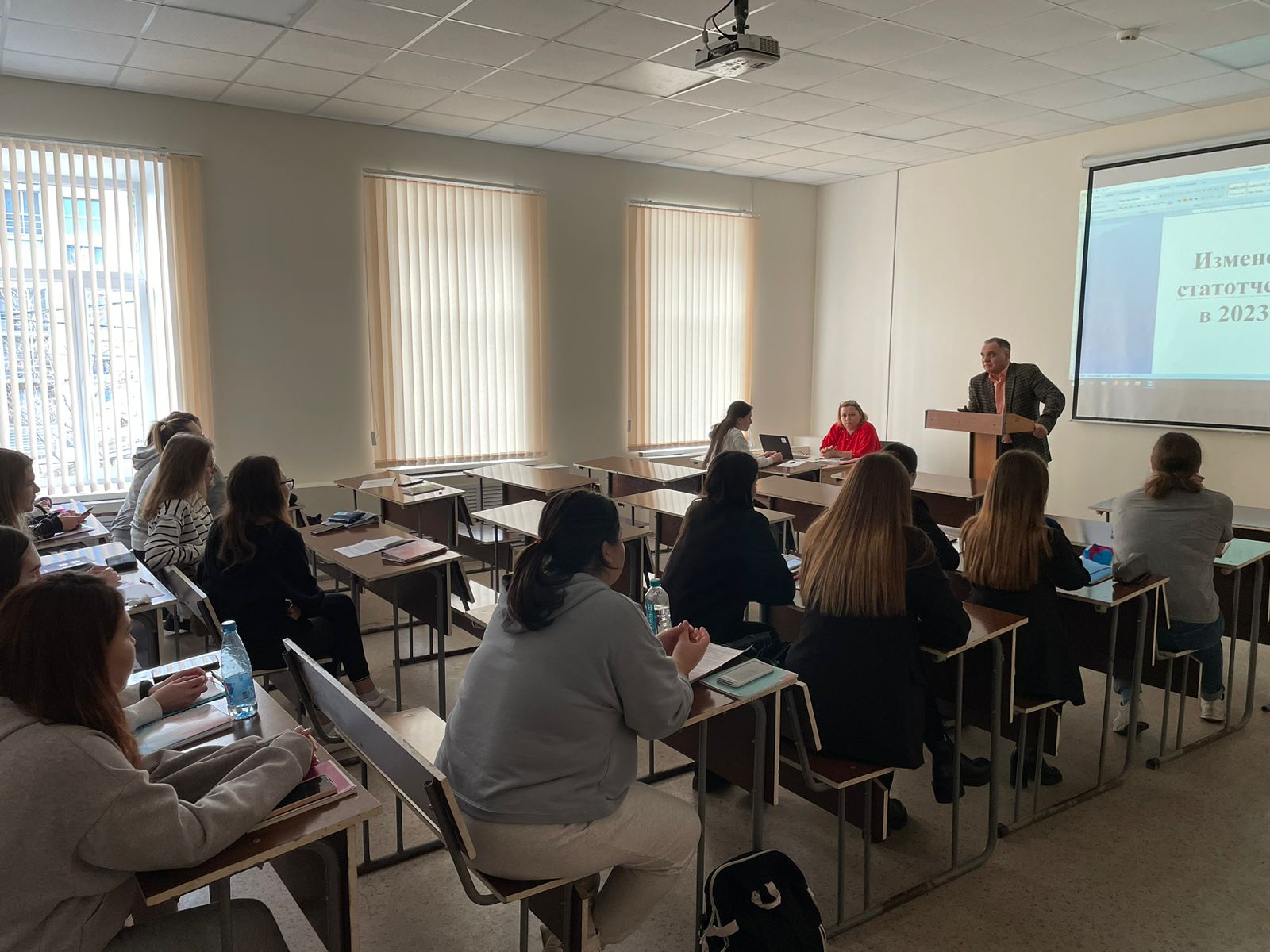 В свою очередь со своими докладами по теме «Изменения в статотчетности в 2023 году» выступили студенты Каримова Карина и Ишмуратов Камиль. Они рассказали что Росстат ввел новые формы для предоставления отчетов за 2022 и 2023 годы по труду. Отчетность по зарплате и кадрам теперь принимается в новом формате согласно приказу №532 от 29.07.2022. А согласно приказу №533 от 29.07.2022 изменились годовые и месячные формы для производственников. Были изменены и утверждены следующие формы федерального статистического наблюдения по кадрам. А также какие  предусмотрены штрафы за не сдачу  форм в Статистику или нарушение сроков на 2023 год.