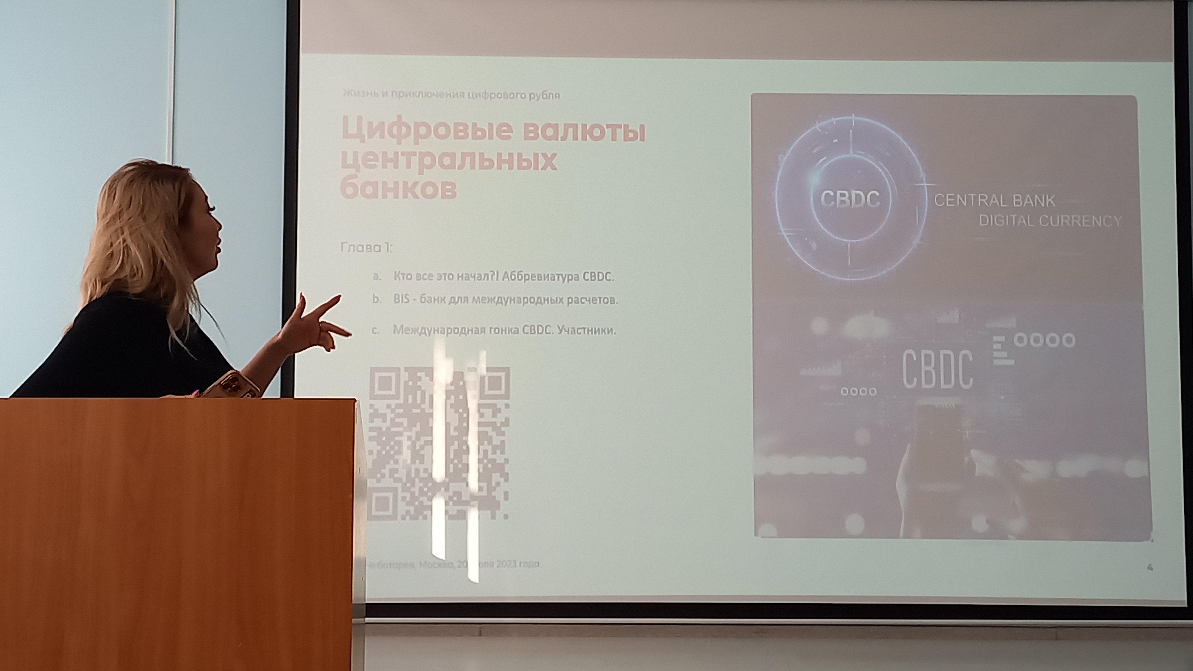 «В марте 2022 года Росбанк начал разработку пилотного проекта  CBDC Банка России. Пилотирование должно было стартовать в начале апреля 2023 года по первоначальному плану Банка России. 11 июля 2023 года. Государственная Дума приняла сразу во втором и третьем чтениях пакет законодательных инициатив по введению цифрового рубля в правовое поле России» - рассказала приглашенная гостья.