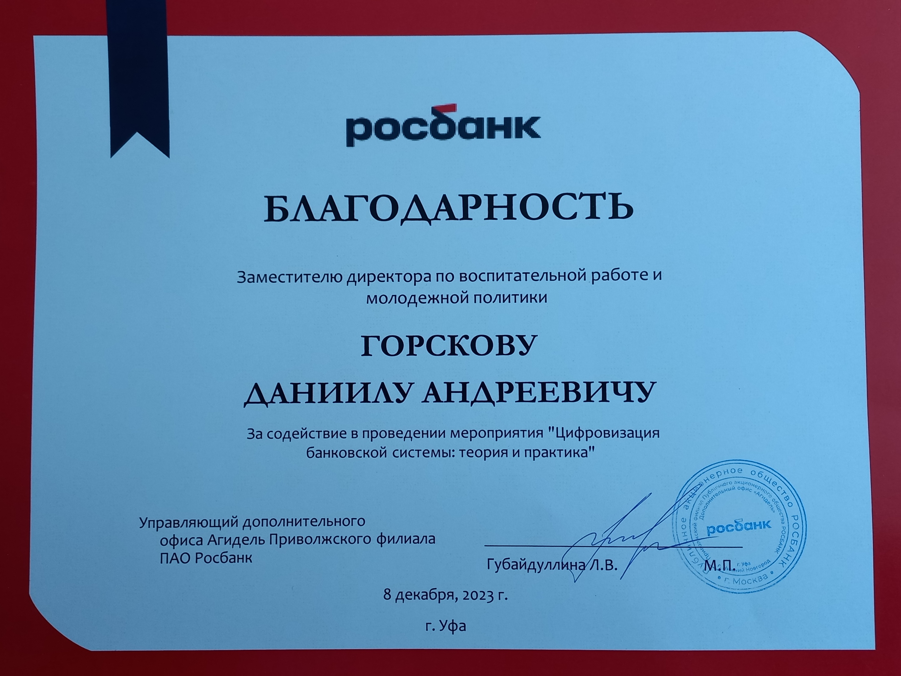 8 декабря 2023 года в ИИПСГО БГПУ им. М. Акмуллы прошел семинар «Цифровизация банковской системы: теория и практика», организованный центром развития предпринимательских компетенций «Профи-Т» (руководители Лутфуллин Ю.Р. и Нефедова В.Н.) и ПАО Росбанк.