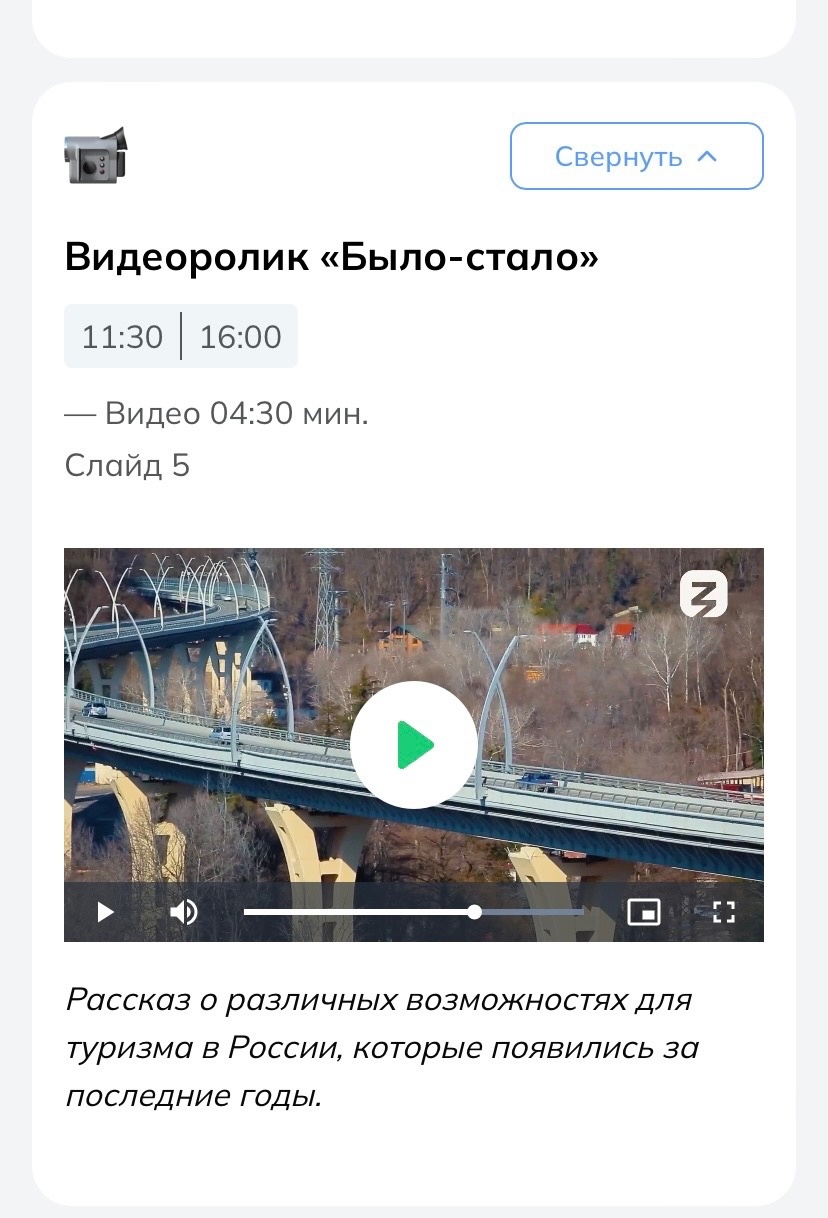 Также в материалах к занятию предложен ролик с выставки «Россия». Представлены материалы игр «Было-стало», интерактив «Профессии в сфере туризма и гостеприимства», видеоролик «Россия — моё будущее» и игра «Будущее или реальность».