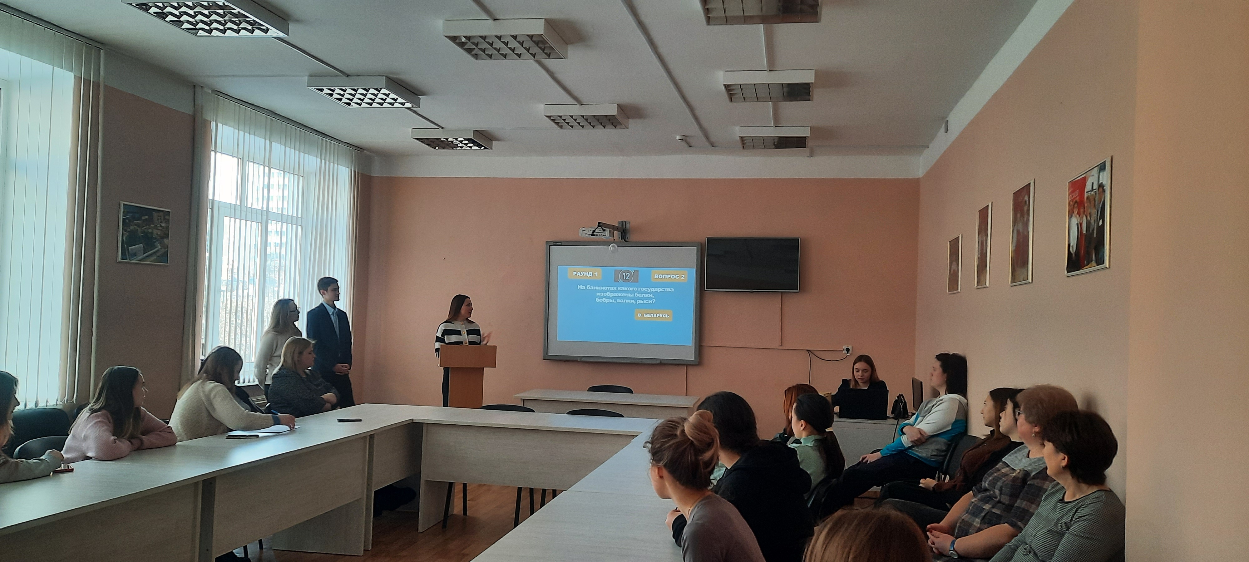 Затем наступила самая оживленная и веселая часть встречи. Студенты устроили квиз по финансовой грамотности. Было 4 раунда: интересные факты, валюта, песенный и фильмы – всё связанное с экономикой и финансовой грамотностью.
