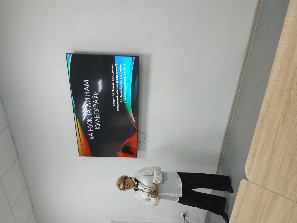 28 марта в рамках деятельности ЦРПК "Адитон" состоялся лекторий "А нужна ли нам культура?". Мероприятие организовали и провели доцент Е.Д. Жукова, студенты 5 курса профиля "Мировая художественная культура и экономика" Р. Сафин и Д. Кучмухаметов. Лекторий посетили старший преподаватель М.А. Чукреева, студенты 4 и 5 курсов профиля "Мировая художественная культура и экономика".