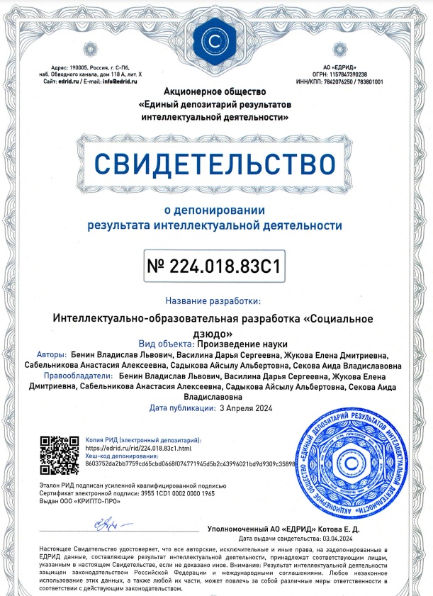 Апробация интеллектуально-образовательной разработки «Социальное дзюдо» уже прошла с воспитанниками разных возрастных групп в рамках работы летних лагерей, а также в работе с одаренными школьниками Республики Башкортостан. В 2023 г. данная разработка стала победителем в Конкурсе на лучший научный проект студентов высших учебных заведений в городском округе город Уфа Республики Башкортостан.