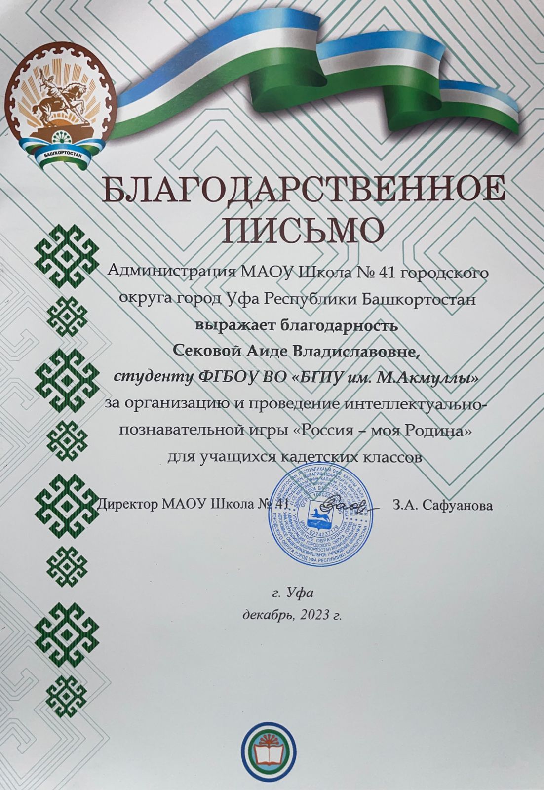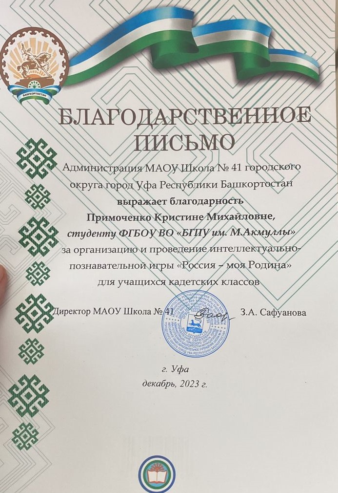 Благодарственные письма Администрации МАОУ Школа №41 ГО г.Уфа Республики Башкортостан за организацию и проведение интеллектуально-познавательной игры "Россия - моя Родина" для учащихся кадетских классов получили: