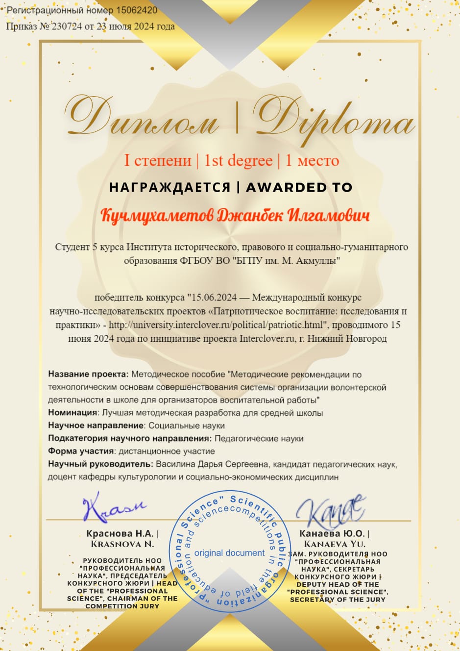 Проект студента Акмуллинского университета одержал победу в Международном конкурсе научно-исследовательских проектов "Патриотическое воспитание: исследования и практики"