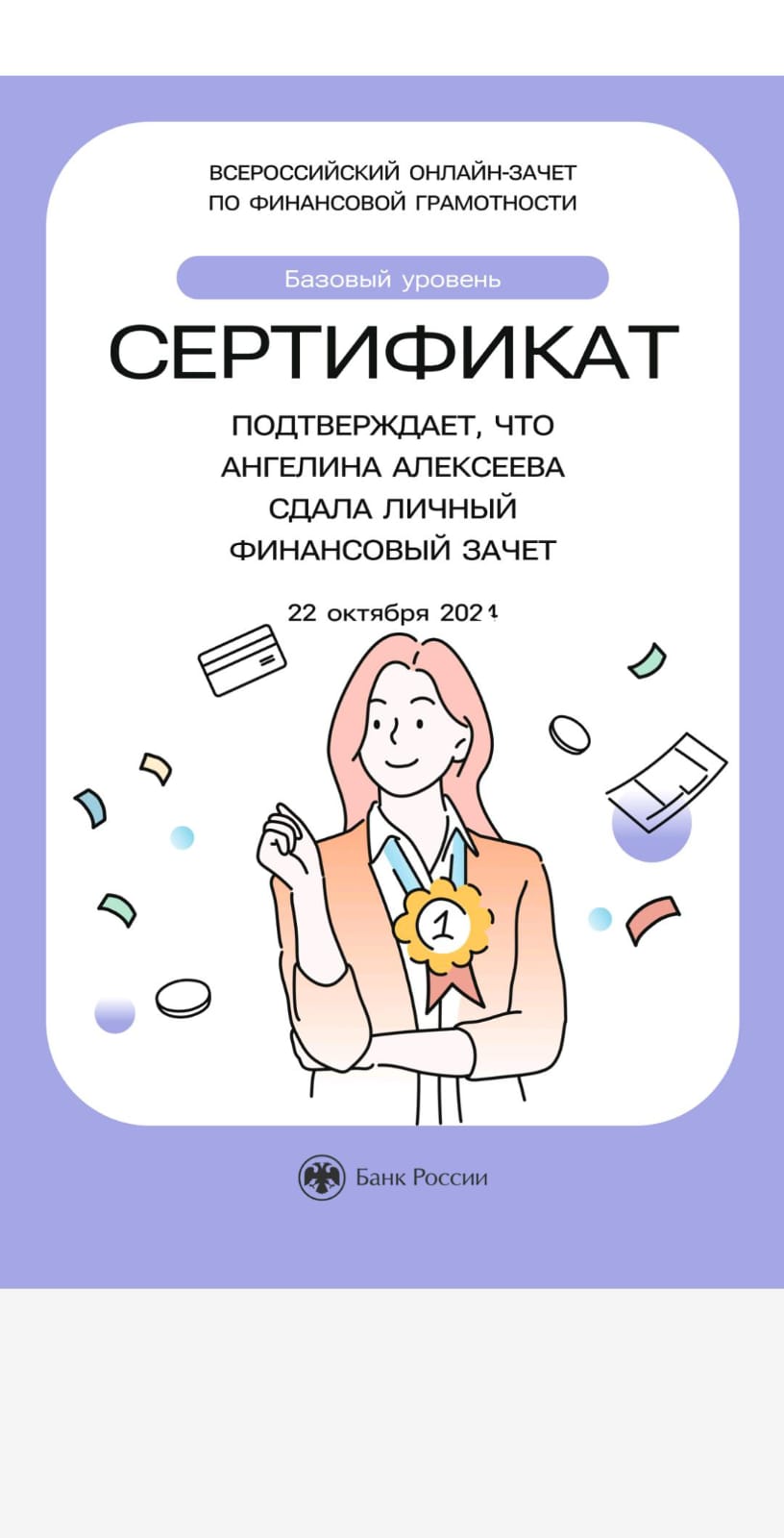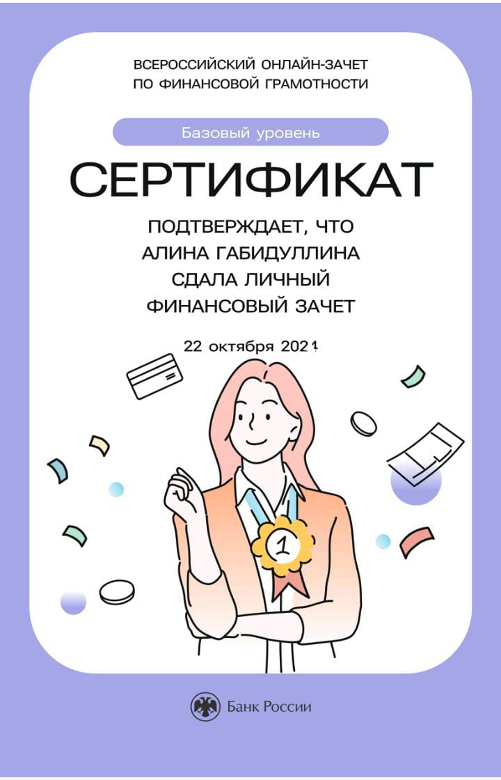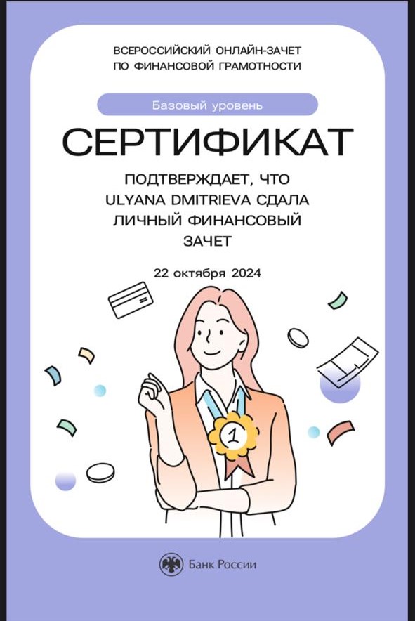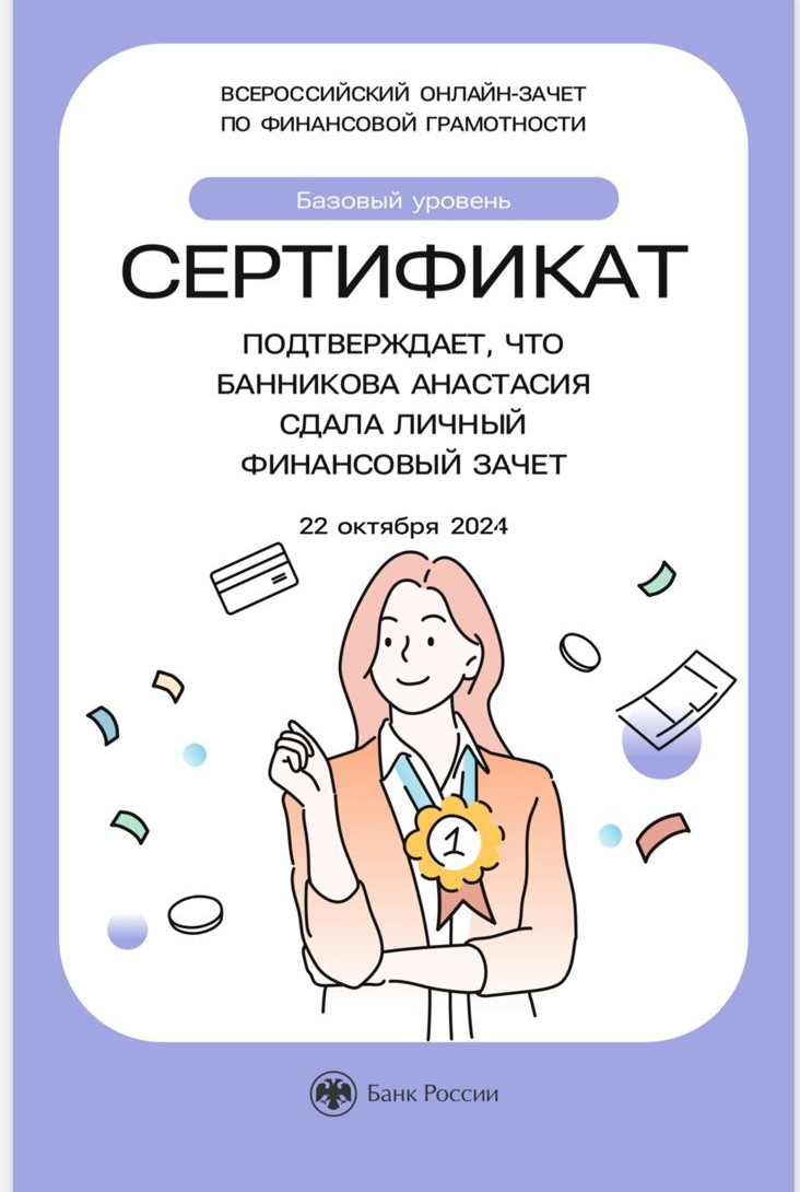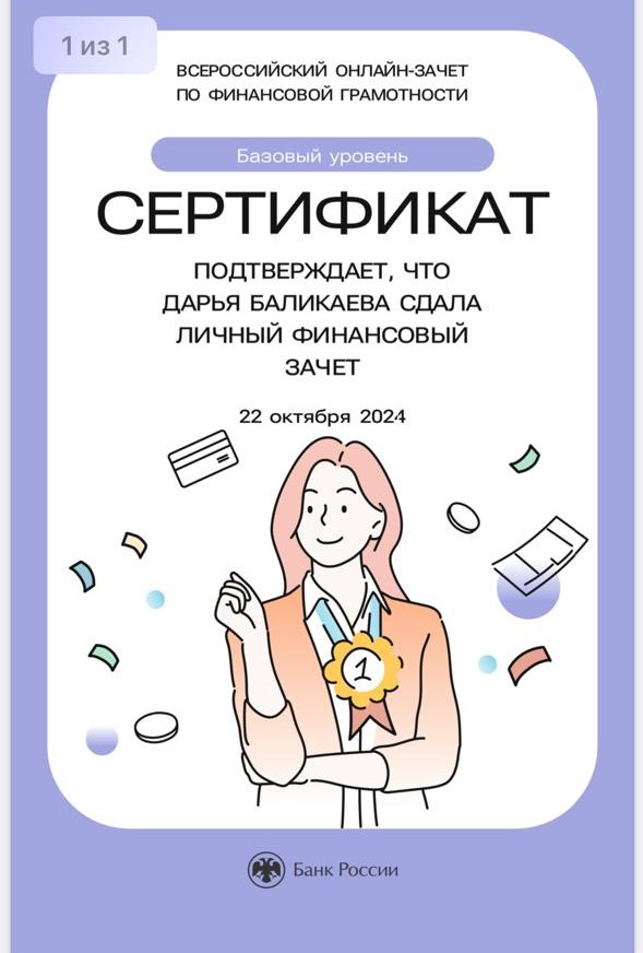 Зачёт по финансовой грамотности – это быстрая оценка необходимых знаний для принятия рациональных финансовых решений в разных жизненных ситуациях, полезные материалы по итогам прохождения зачёта, проверенная и актуальная информация от экспертов Банка России. По итогам онлайн – зачёта, обучающимся был выдан электронный сертификат.
