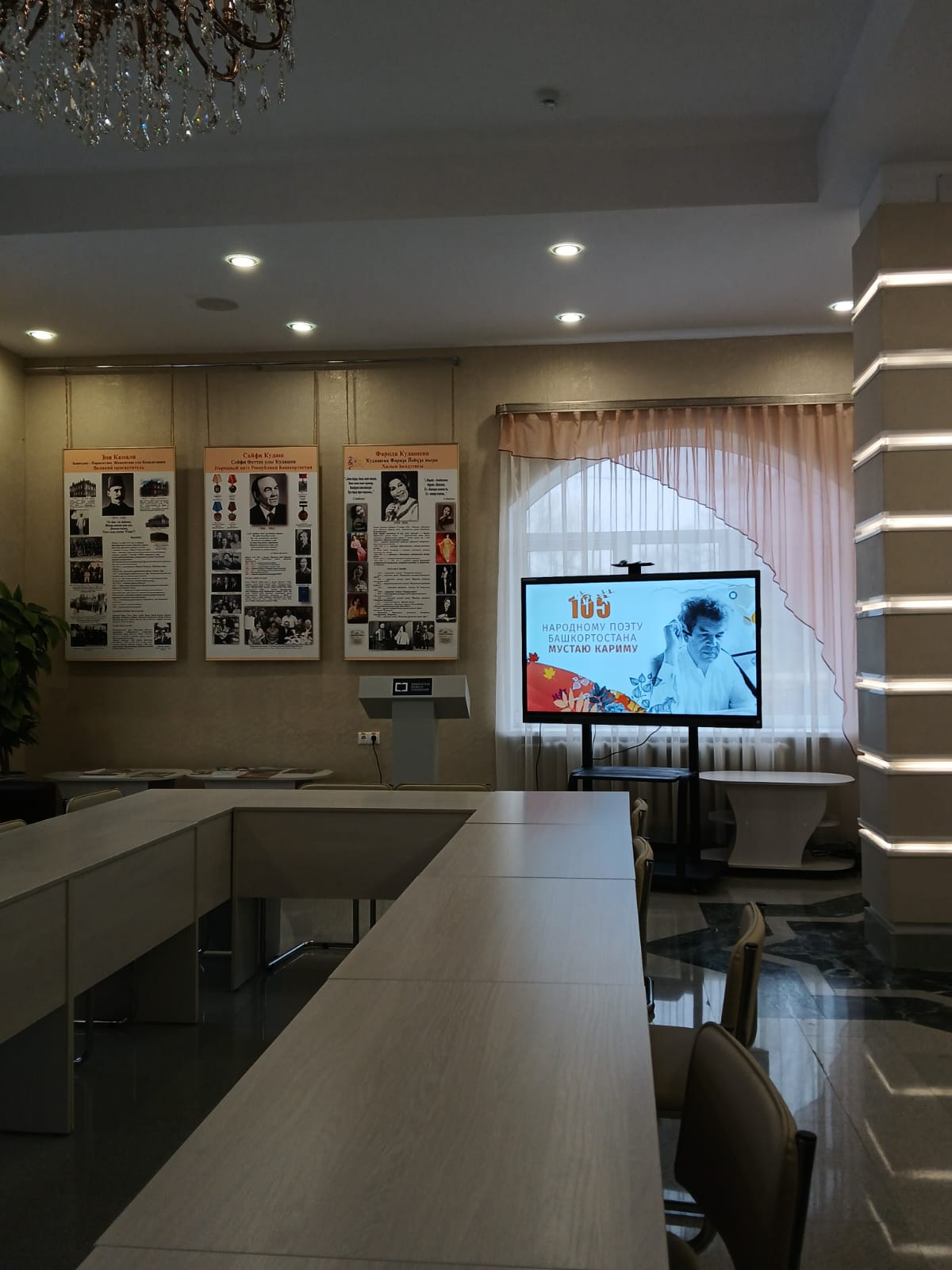 Экскурсия началась в литературном музее, где были представлены информационные стенды, посвященные великим деятелям Республики Башкортостан. Здесь можно было узнать много нового и интересного о таких знаменитых людях как Мустай Карим, Зия Камали, Сайфи Кудаш, Фарида Кудашева и т.д. Также в литературном музее посетители ознакомились с интерактивными элементами, например, с устройством под названием монофон, с помощью которого можно услышать голос Мустая Карима, песни и стихотворения.