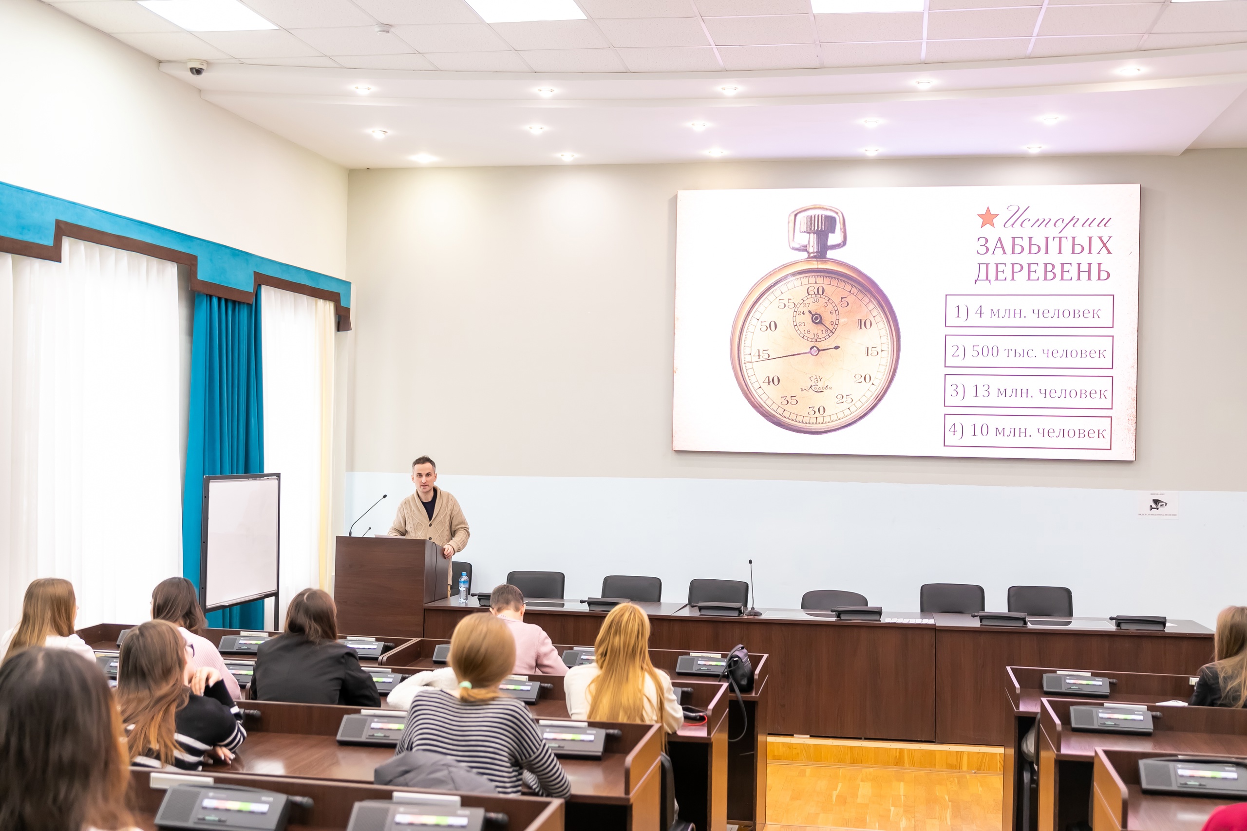 Алексей Стецюк в своём выступлении отметил важность связи регионов, народов России и поколений для сохранения исторической памяти. Николай Каташов рассказал студентам о работе творческой группы по созданию фильмов проекта «Истории забытых деревень».