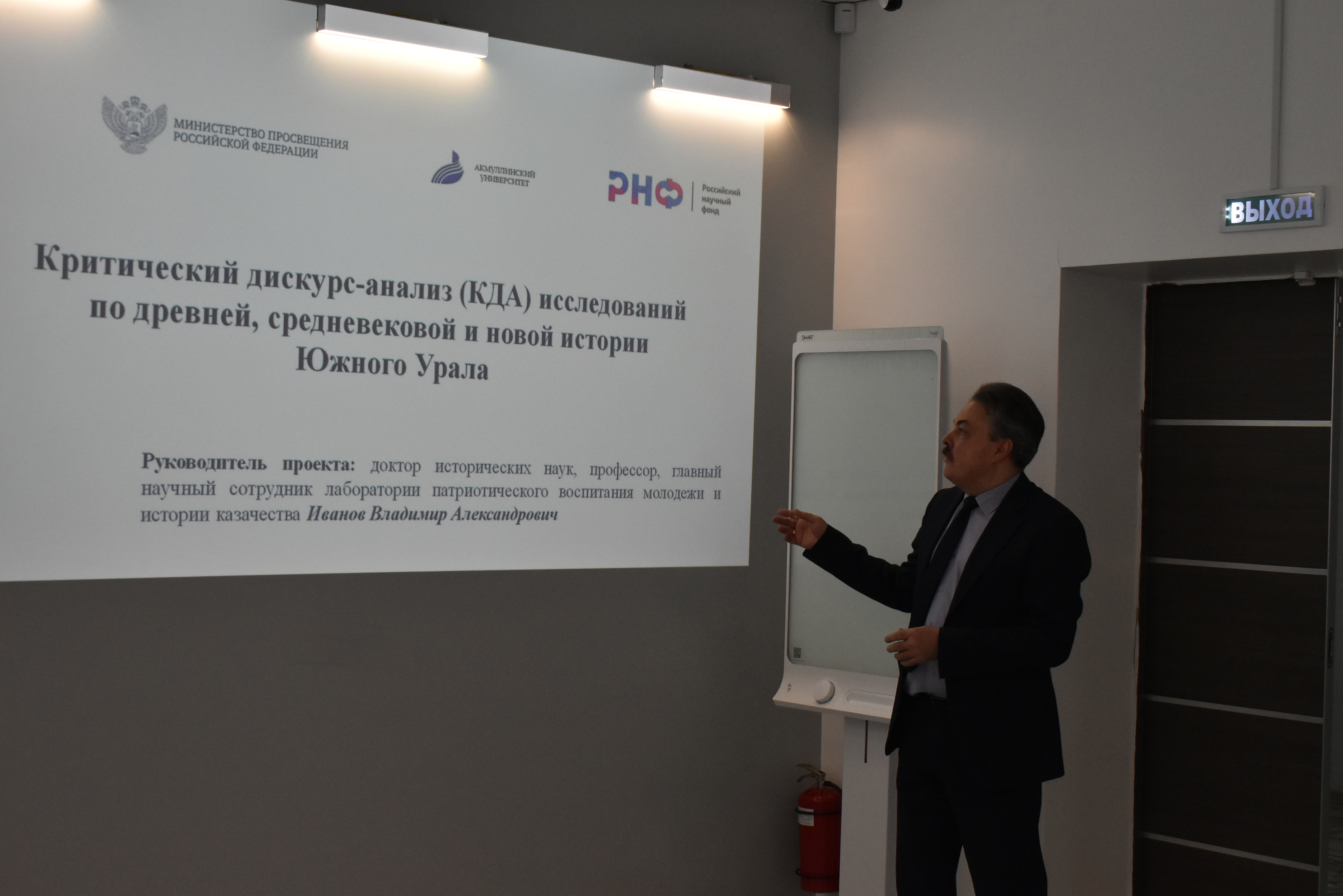 Доцент кафедры Отечественной и всеобщей истории  Алексей Иванович Кортунов познакомил гостей с результатами работы по выполнению научного исследования в рамках гранта Российского научного фонда на тему «Критический дискурс-анализ исследований по древней, средневековой и новой истории Южного Урала», рассказал о деятельности Научно-образовательной лаборатории патриотического воспитания молодежи и истории казачества БГПУ им. М.Акмуллы.