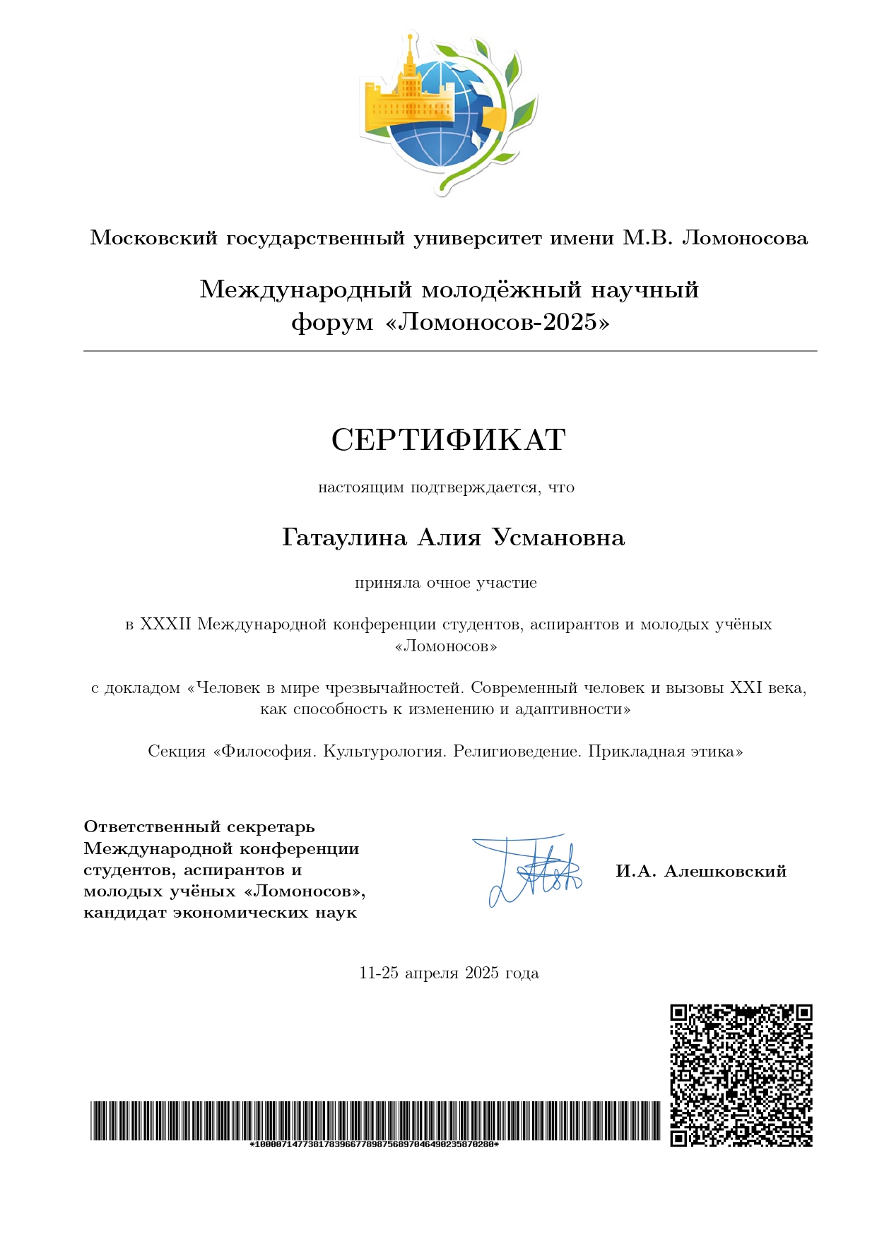 Акмуллинский университет представляет лидер философского клуба «Генезис» Гатаулина Алия, которая выступла с докладом на секции «Философия. Культурология. Религиоведение. Прикладная этика, Социальная философия и философия истории». Тема ее выступления «Человек в мире чрезвычайностей. Современный человек и вызовы XXI века, как способность к изменению и адаптивности» актуальна и важна для понимания современных социальных процессов.