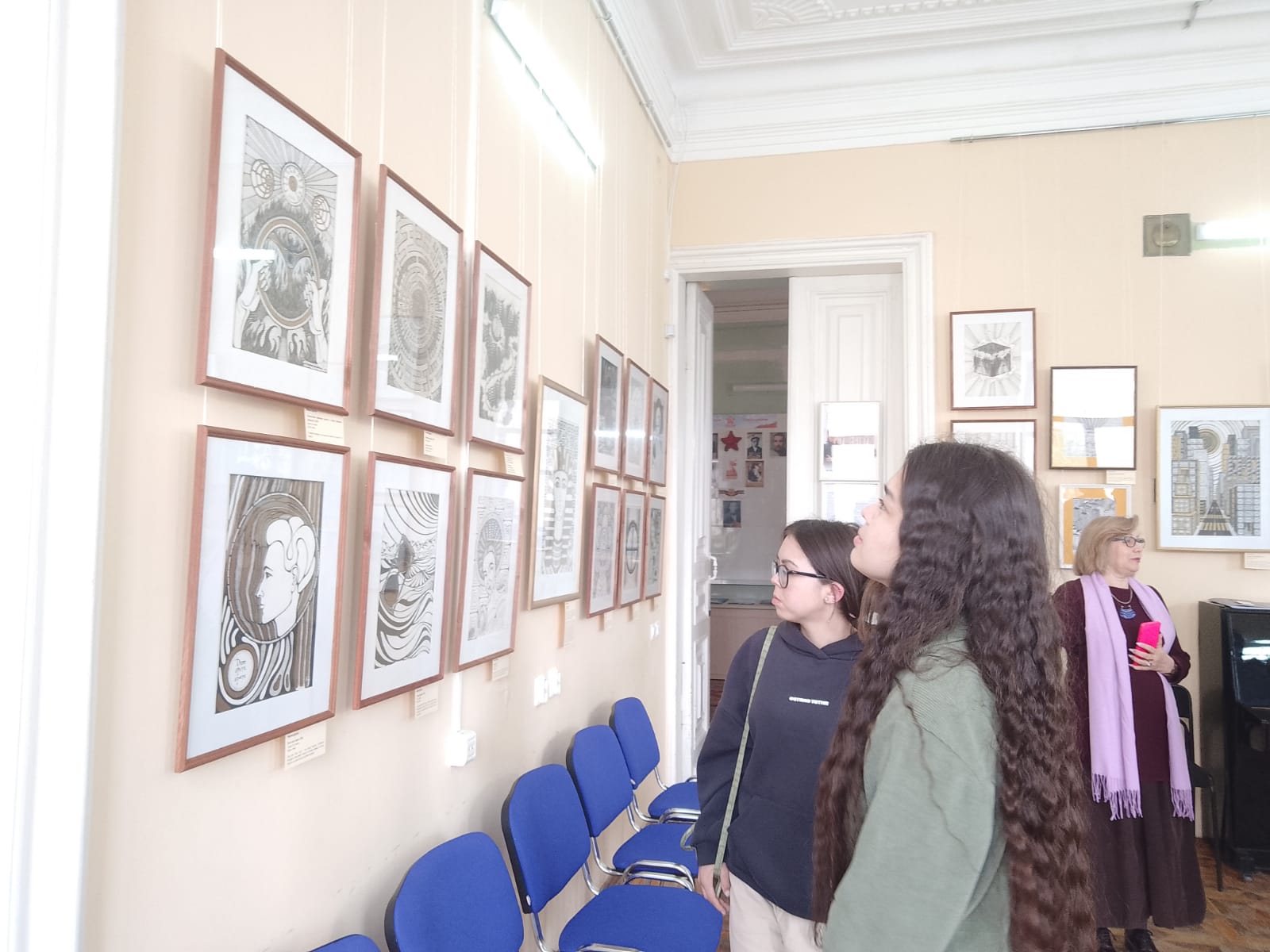 Во втором выставочном зале студенты познакомились с  персональной выставкой московского художника-графика Марины Дудиной  «Рисую, следовательно, существую». Экспозиция включает в себя порядка 50 произведений. Индивидуальная графическая манера Марины Дудиной характеризуется гибкой выразительной линией, а мастерское владение тональной градацией помогает зрителю глубже проникнуть в авторский замысел. Исследуя взаимодействие предельно контрастных цветов — черного и белого, художница добилась гипнотического воздействия на зрителя, приглашая его к размышлению.