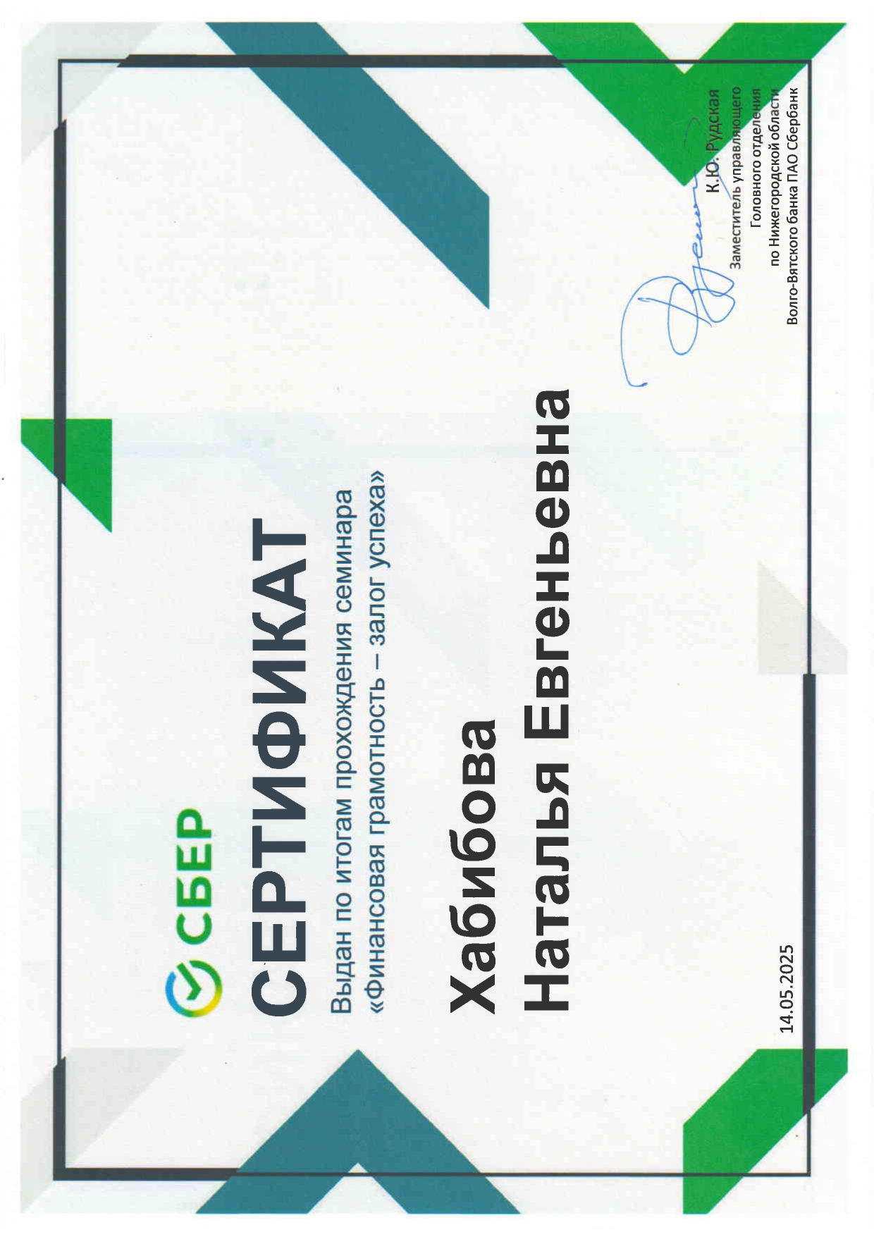 14 мая 2025 года в главном офисе Нижегородского отделения Сбербанка состоялся образовательный семинар «Финансовая грамотность – залог успеха» для преподавателей экономических дисциплин. В нем приняли участие преподаватели кафедры культурологии и социально-экономических дисциплин – Н.Е. Хабибова и Д.С.Василина. Мероприятие прошло в смешанном формате. В рамках семинара были рассмотрены следующие темы:
