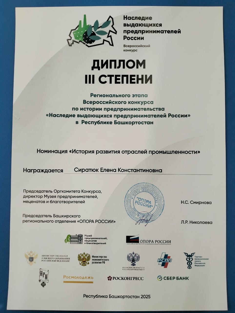 Дипломом  III степени в номинации «История развития отраслей промышленности» была награждена студентка 3 курса Елена Сиратюк.  Научным руководителем  выступила кандидат экономических наук, доцент кафедры обществознания, права и социального управления Айгуль Забировна Харисова.
