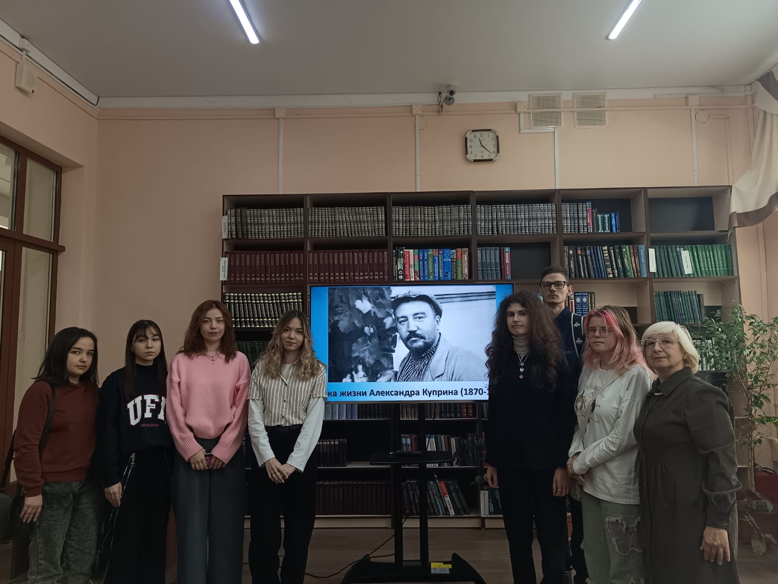 30 сентября студенты 4 курса Библиотечно-информационная деятельность вместе с преподавателем Гильмияновой Риммой Аскаровной в рамках работы студенческого объединения "Аналитик" пришли на лекцию "Река жизни Александра Куприна", проходившую в стенах Национальной библиотеки им. Ахмет-Заки Валиди. Лектор рассказала о жизни известного писателя.