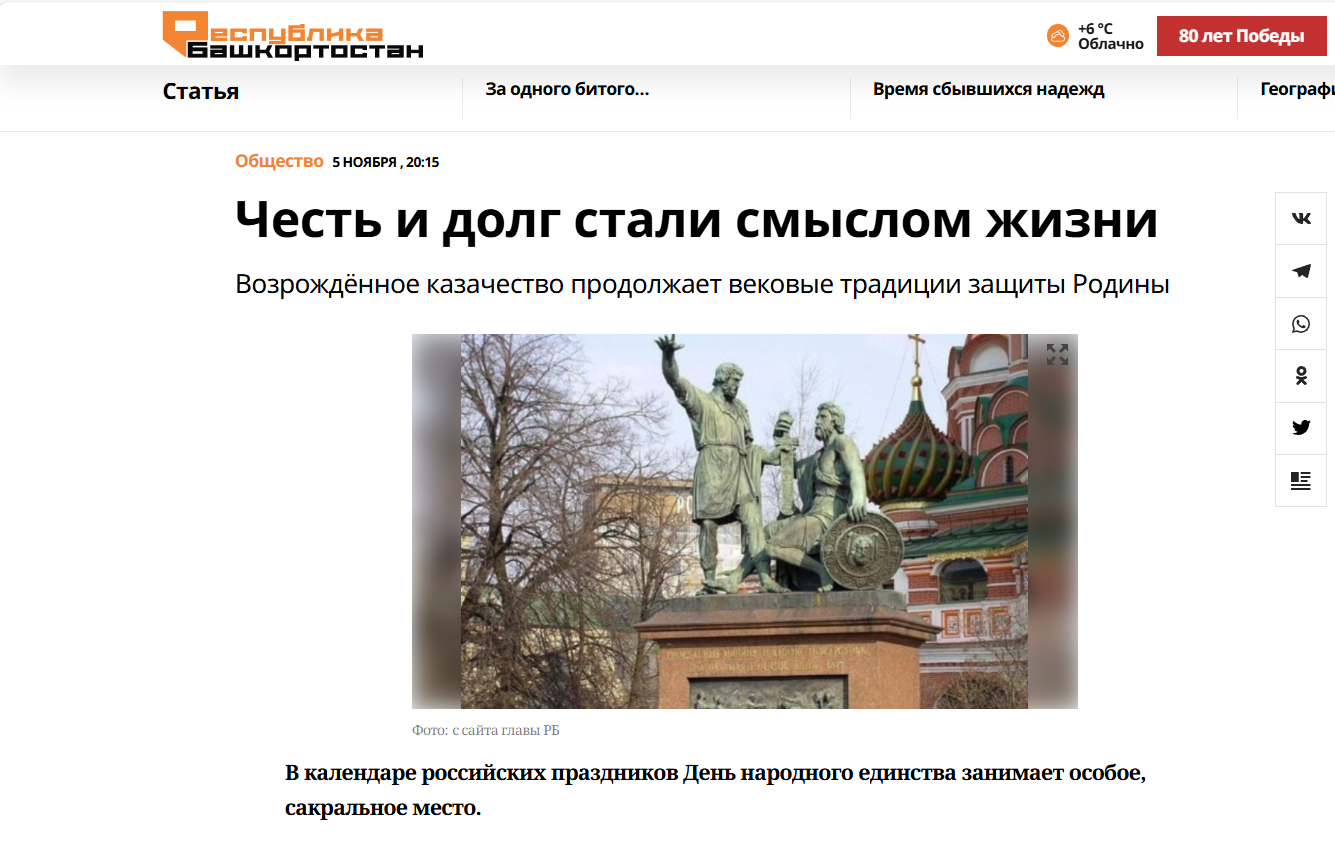 В газете «Республика Башкортостан» ко Дню народного единства вышла статья кандидата исторических наук Алексея Кортунова, посвящённая роли казачества в истории России.