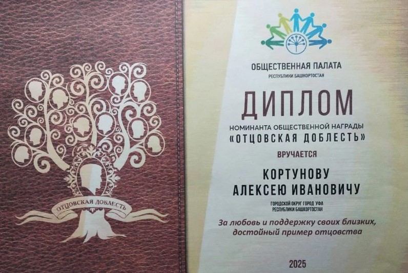 Диплом номинанта общественной награды «Отцовская доблесть» «За любовь и поддержку своих близких, достойный пример отцовства» награжден многодетный отец, кандидат исторических наук, доцент кафедры отечественной и всеобщей истории Башкирского государственного педагогического университета им. М. Акмуллы Кортунов Алексей Иванович. Награждение состоялось в уфимской школе №97 им. Героя Советского Союза Г.А. Ахмерова, где Алексей Иванович проходил обучение в 1982-1992 гг. Ссылка на новость школы: https://vk.com/wall-419966_515...