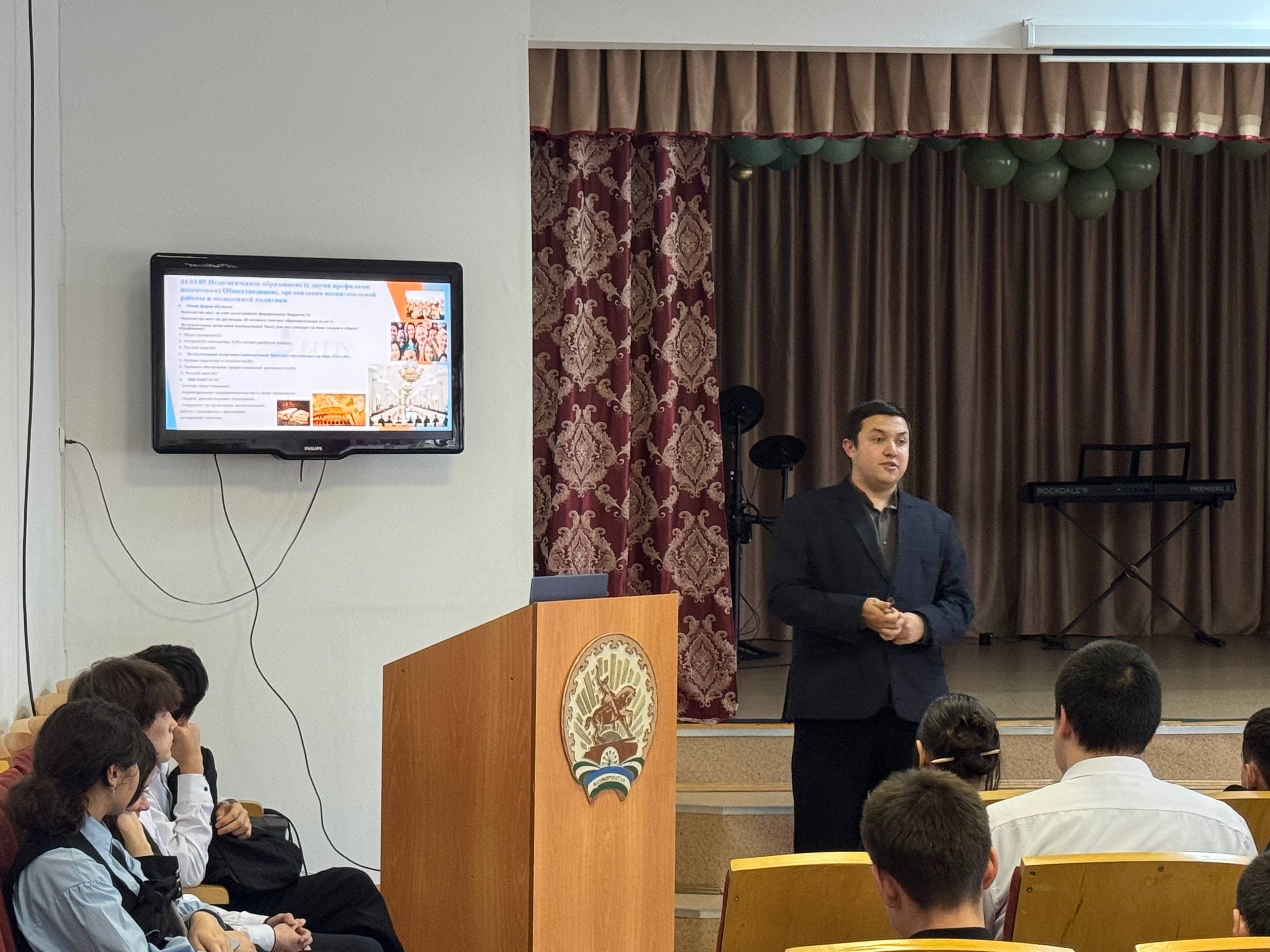 В профориентационном мероприятии со школьниками МОБУ лицея с. Верхние Киги Алик Зиннуров поделился своим личным опытом поступления, обучения и получения знаний, особенностями студенческой жизни сделав тему выбора вуза более живой и понятной.