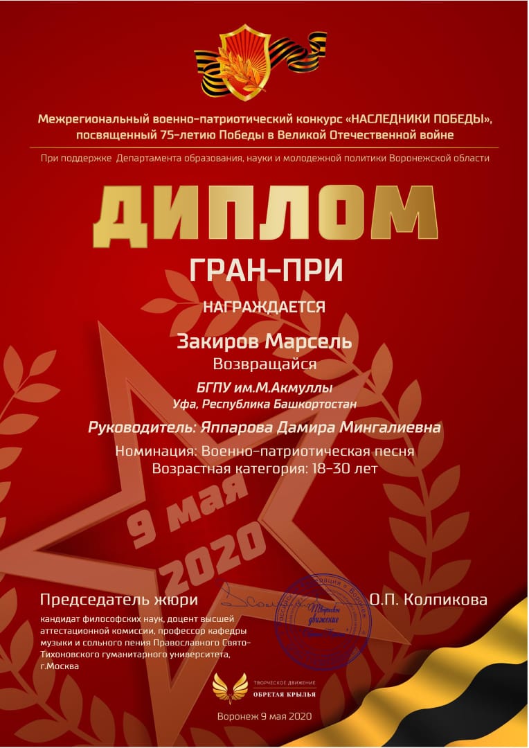 · обладатель ГРАН-ПРИ Межрегионального военно-патриотического конкурса «Наследники Победы» - 20 мая 2020 https://vk.com/nasledniki36 (исполнил песню Севак Ханагян «Возвращайся домой»
