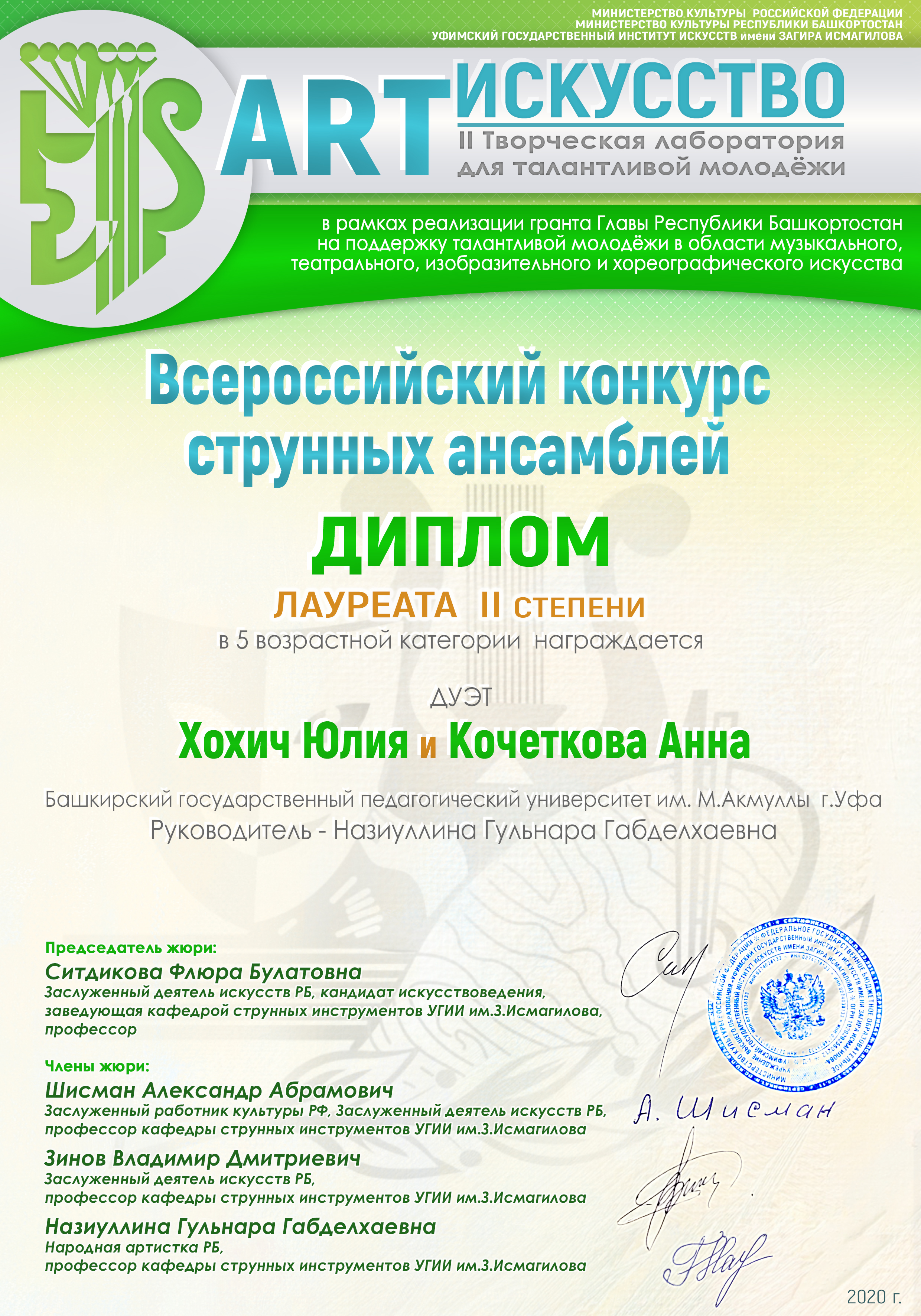 Студенты профиля "Музыкальное образования" Хохич Юлия и Кочеткова Анна стали лауреатами II  степени во Всероссийском конкурсе струнных ансамблей в номинации "Дуэт". Руководитель - Назиуллина Гульнара Габделхаевна.