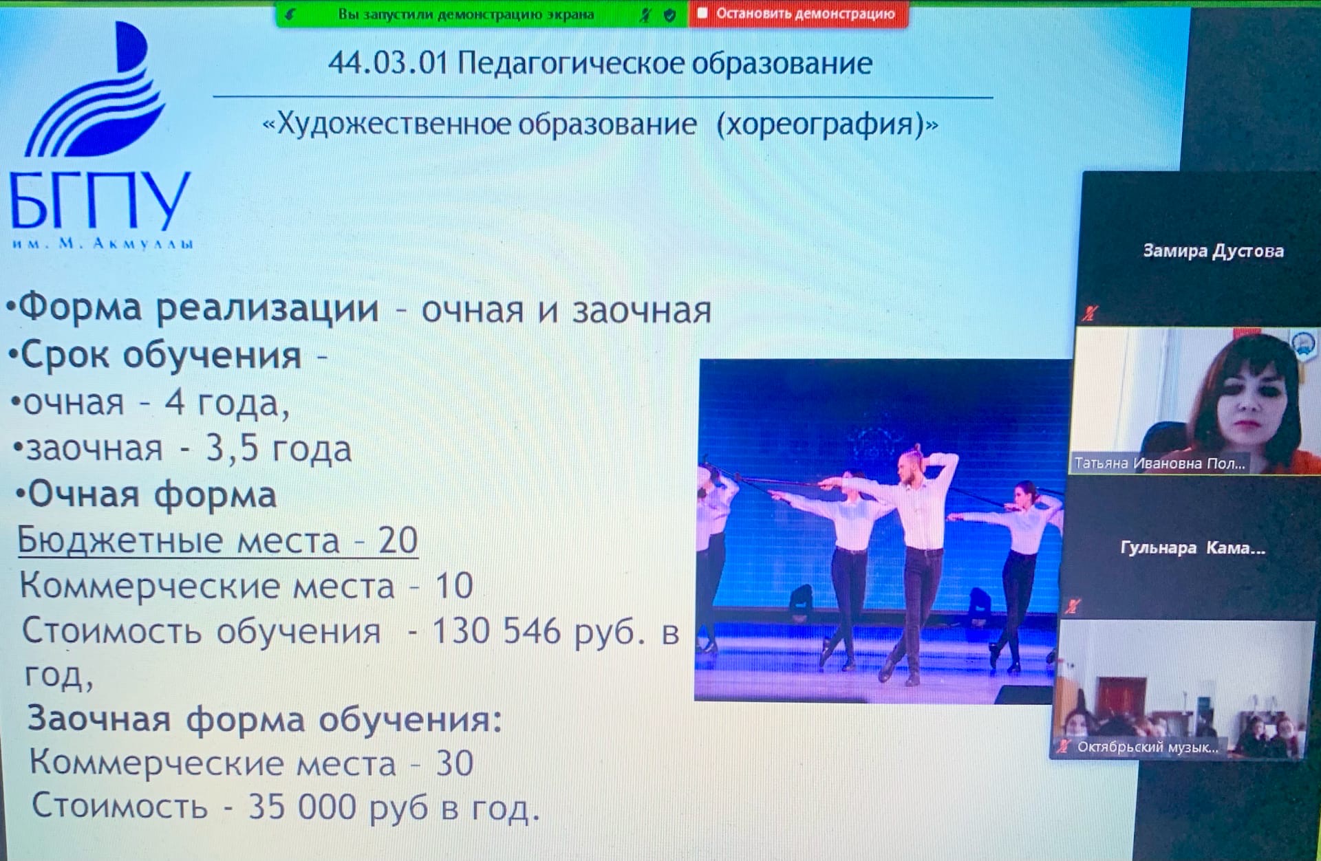 16 декабря 2020 года прошло дистанционное профориентационное мероприятие от кафедры музыкального и хореографического образования на платформе Zoom с ГБПОУ РБ «Уфимское училище искусств (колледж)», ГБПОУ РБ «Октябрьский музыкальный колледж», ГБПОУ РБ «Салаватский музыкальный колледж». В ходе мероприятия заведующей кафедрой МХО Татьяной Ивановной Политаевой была представлена информация о направлениях подготовки кафедры МХО, о вступительных испытаниях, о сроках подачи документов. А также студентам было предложено участие в Акмуллинской олипиаде по музыке и по хореографии.