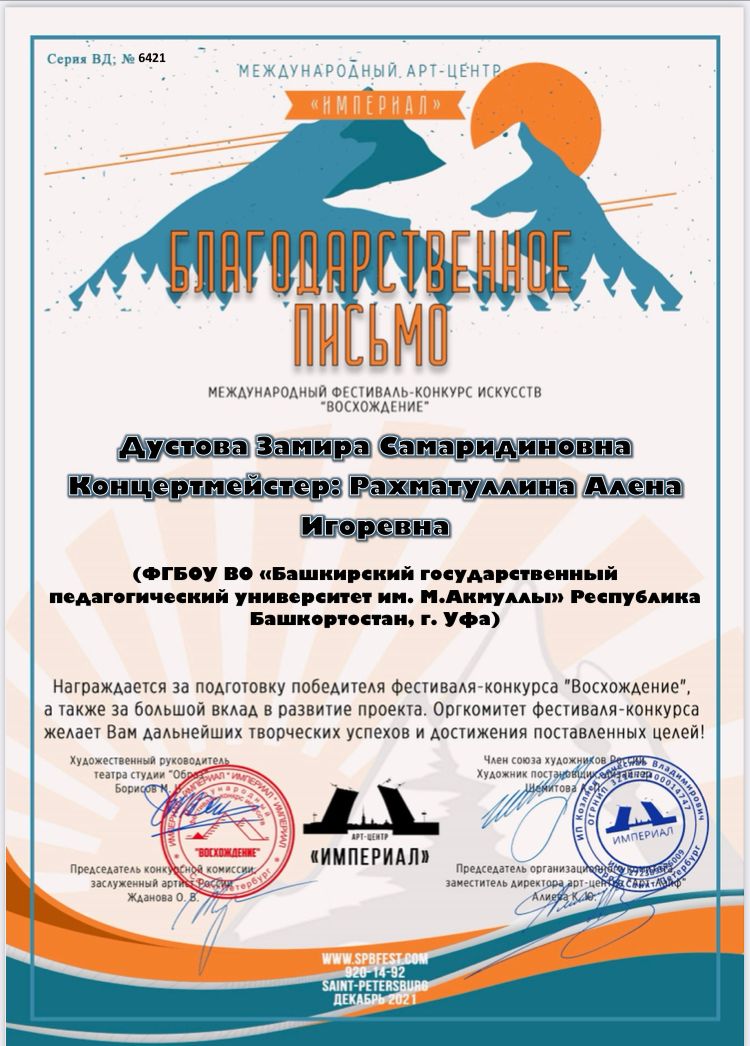 Поздравляем студентов, педагога по классу "Вокал" Замиру Сааридиновну Дустову и концертмейстера Алену Игоревну Рахматуллину с высокими наградами!