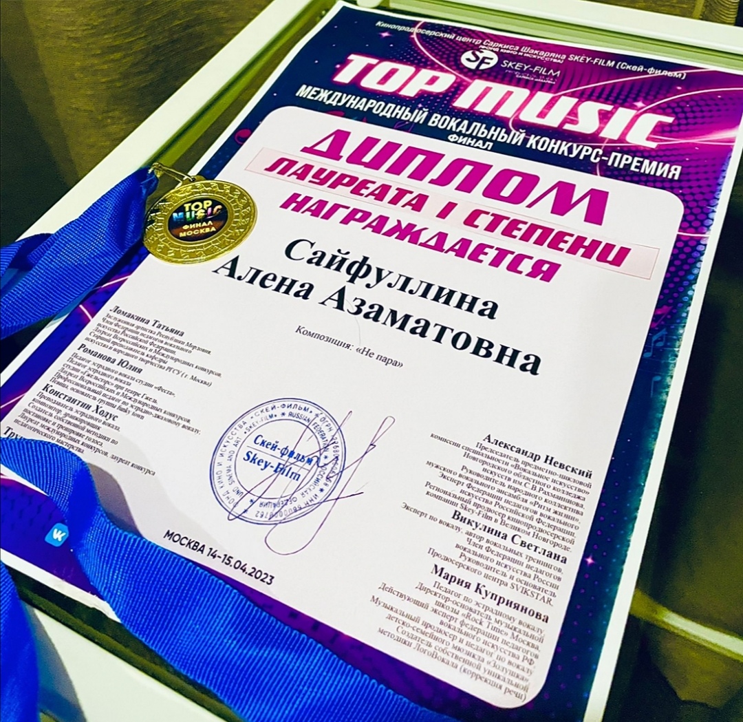 Студентка кафедры музыкального и хореографического образования Алёна Сайфуллина стала Лауреатом I степени Финального этапа Международного вокального конкурса-премии TOP MUSIC в городе Москве.