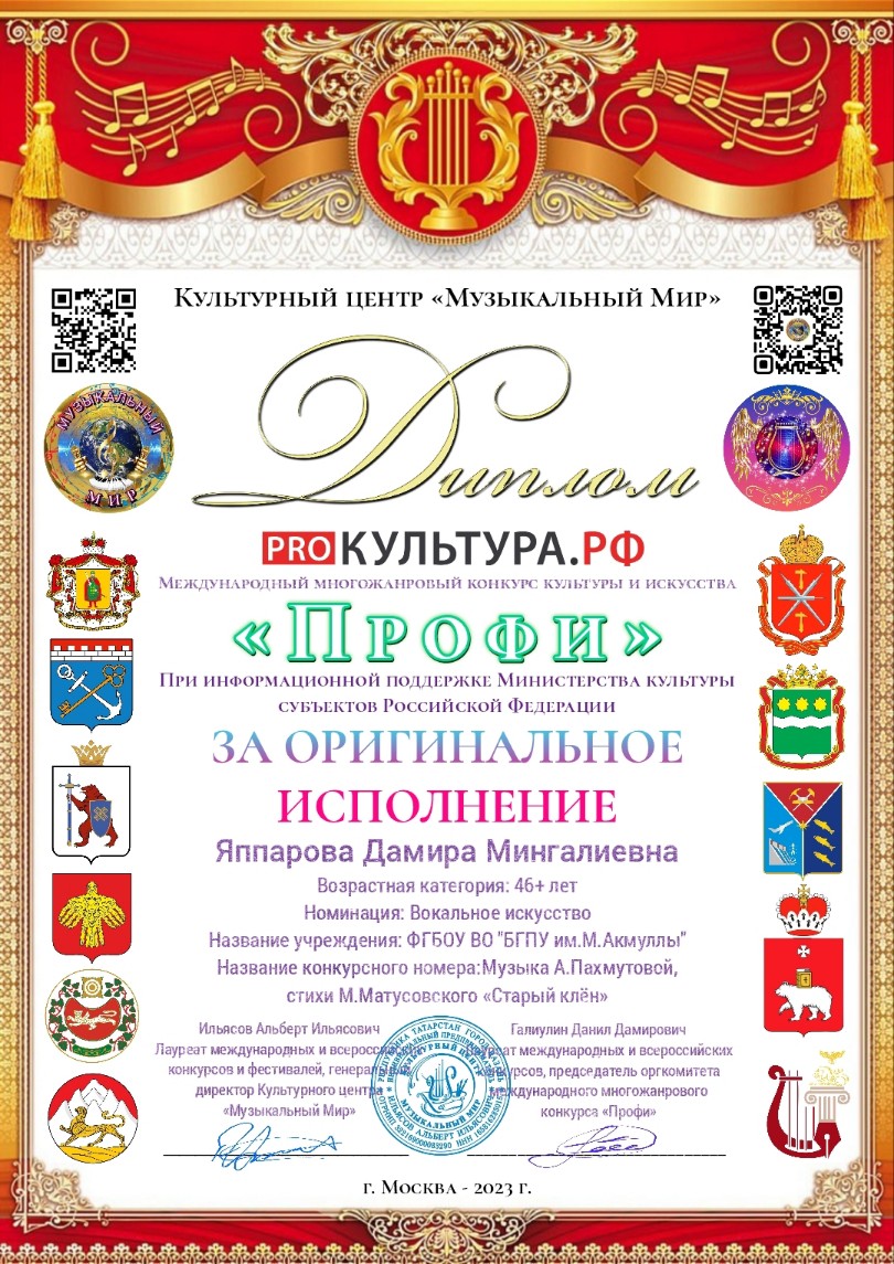 Старший преподаватель кафедры музыкального и хореографического образования Яппарова Дамира Мингалиевна стала обладателем ГРАН-ПРИ и диплома за оригинальное исполнение Международного многожанрового конкурса культуры и искусства «ПРОФИ» в номинации «вокальное искусство» при информационной поддержке Министерства культуры субъектов Российской Федерации.