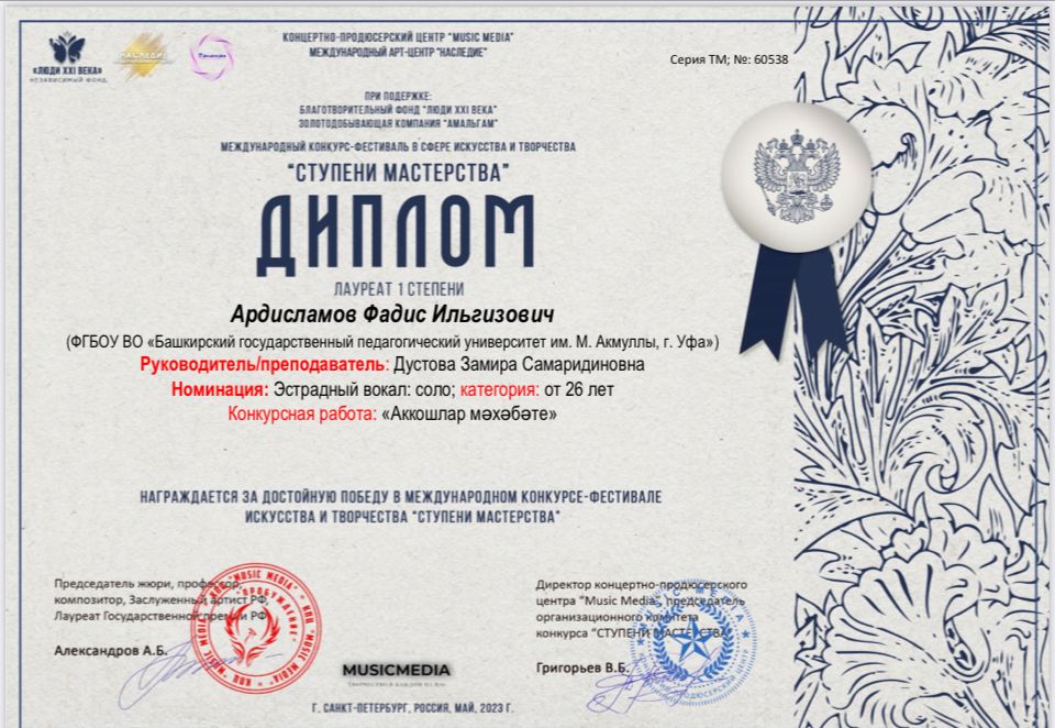 • Диплом лауреата I  степени - Ардисламов Фадис (номинация "Вокальное искусство" (эстрадный вокал), от 26 лет).