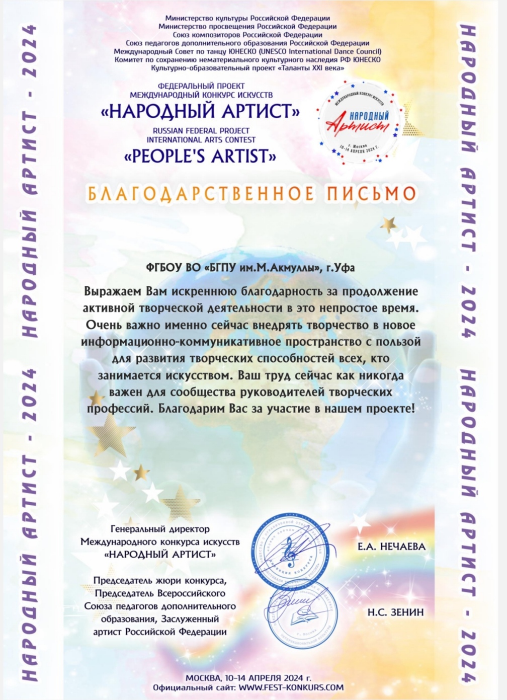 Доцент кафедры музыкального и хореографического образования Яппарова Дамира Мингалиевна стала лауреатом I степени Международного конкурса искусств – «НАРОДНЫЙ АРТИСТ» в номинации «вокал». Федеральный онлайн-проект «V Международный конкурс искусств – НАРОДНЫЙ АРТИСТ 2024» проводится согласно ч. 2 ст. 77 Федерального закона Российской Федерации «Об образовании в Российской Федерации» № 273-ФЗ от 29.12.2012 г. в целях выявления и поддержки лиц, проявивших выдающиеся способности, и направлен на выявление и развитие у обучающихся интеллектуальных и творческих способностей, на пропаганду научных знаний, творческих и спортивных достижений.