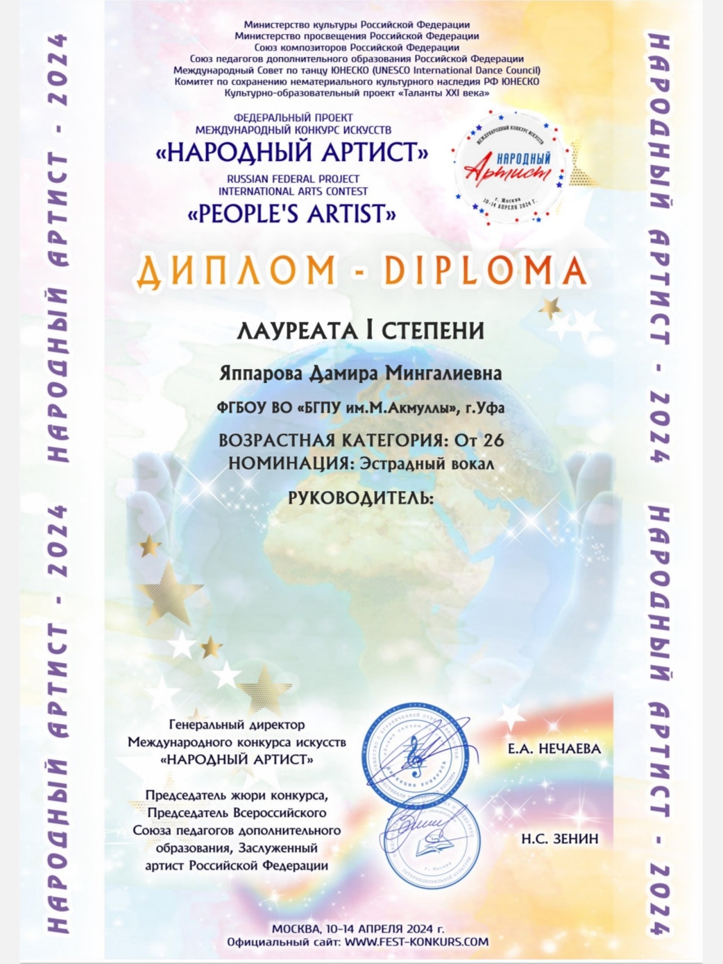 Преподаватель кафедры музыкального и хореографического образования Яппарова Дамира Мингалиевна стала лауреатом I степени Международного конкурса искусств – «НАРОДНЫЙ АРТИСТ»