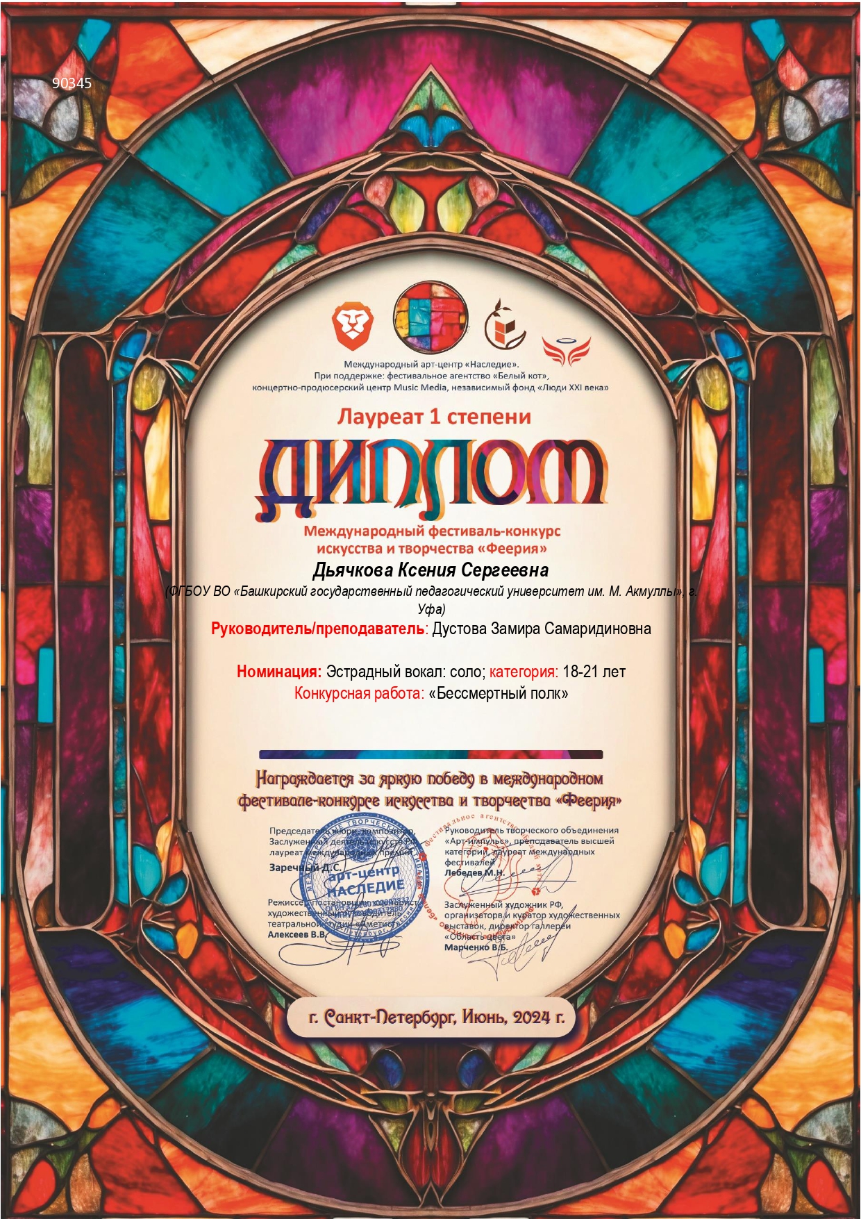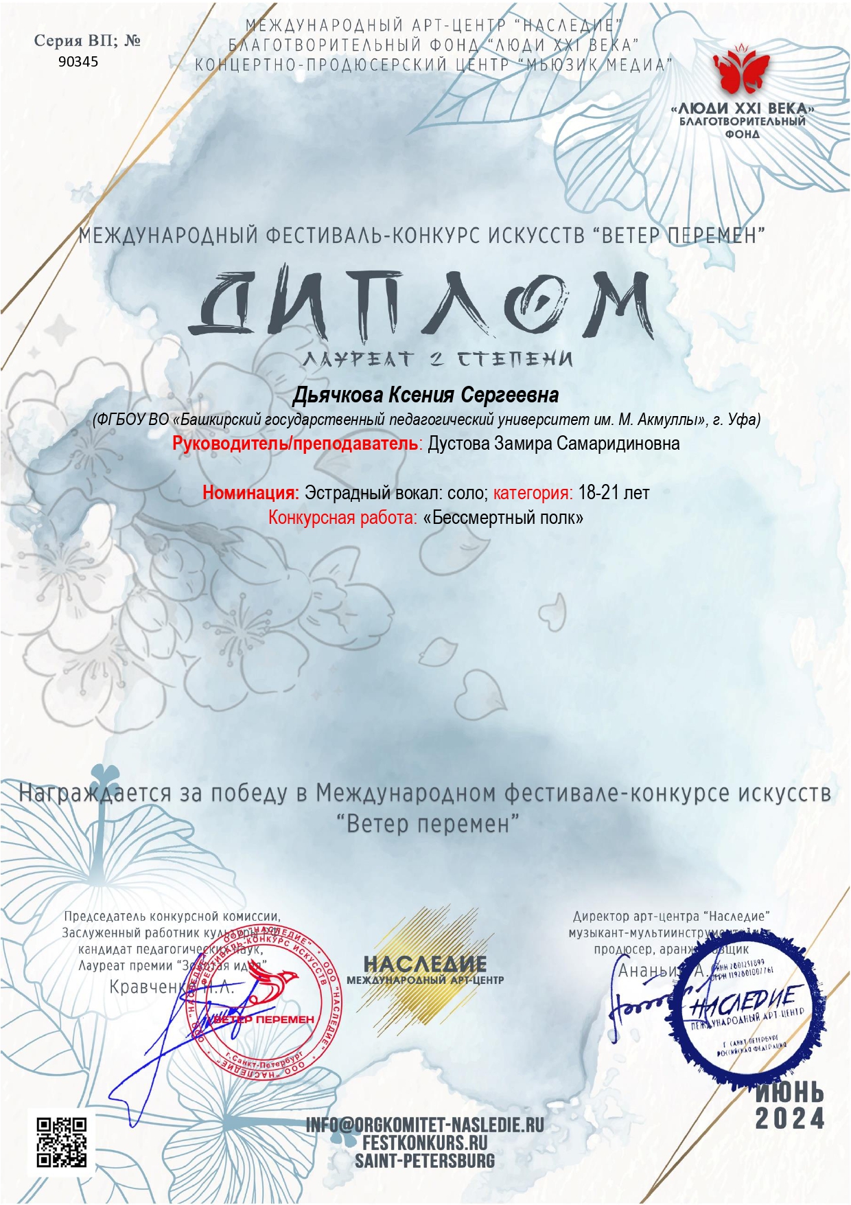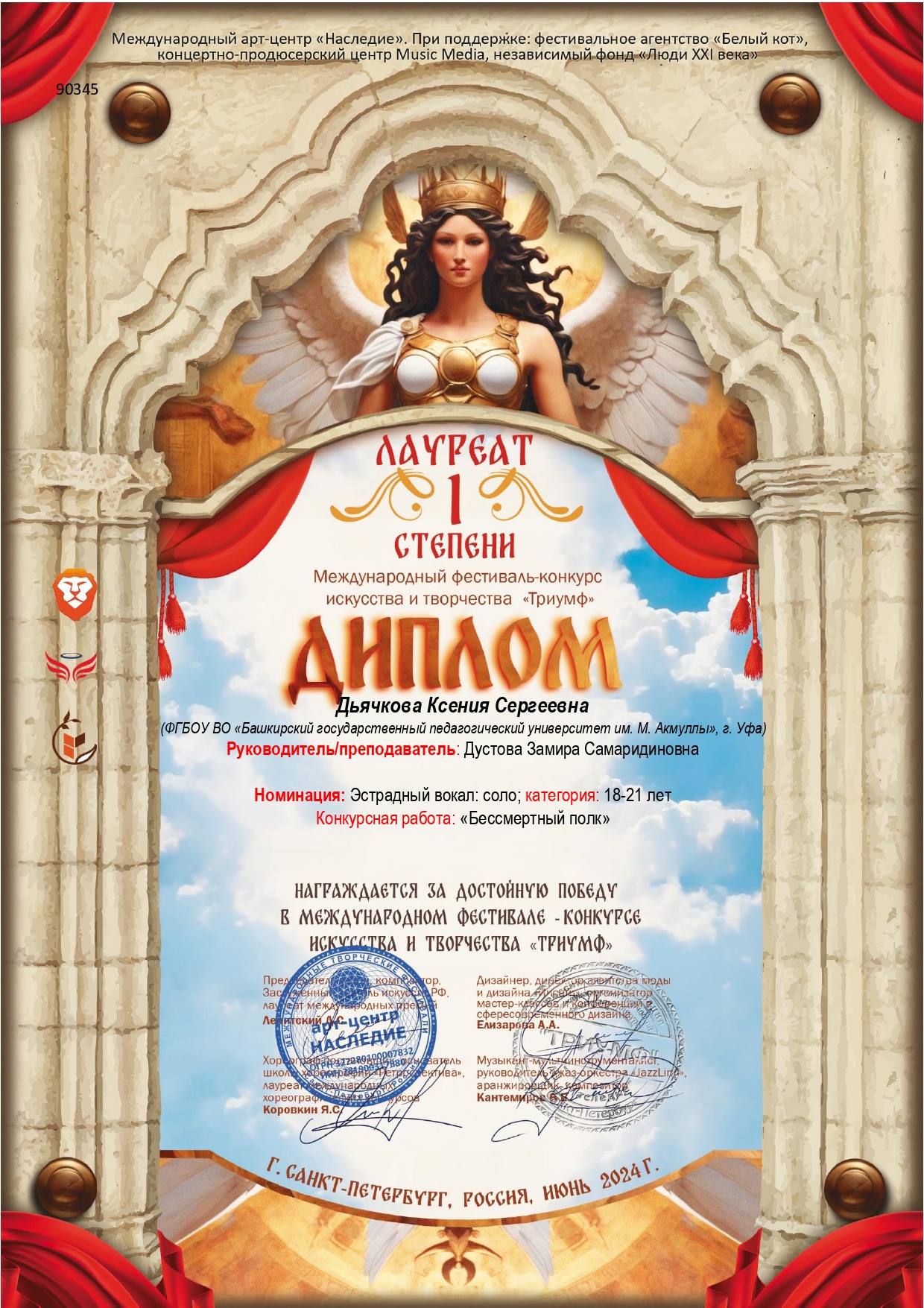 По итогам конкурсных прослушиваний Ксения стала обладателем дипломов I и II степени в номинации «Вокальное искусство соло, эстрадный вокал", категория 18-21 год.