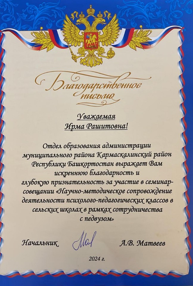 20 августа 2024 г. профессор кафедры музыкального и хореографического образования Ирма Рашитовна Тагариева приняла участие в августовском совещании учителей и директоров школ Кармаскалинского района.