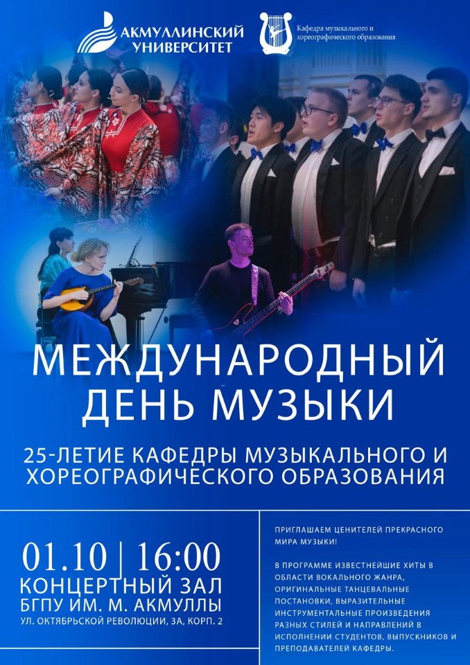 Кафедра музыкального и хореографического образования Акмуллинского университета приглашает на праздничный концерт, посвященный Международному дню музыки и 25-летию кафедры.
