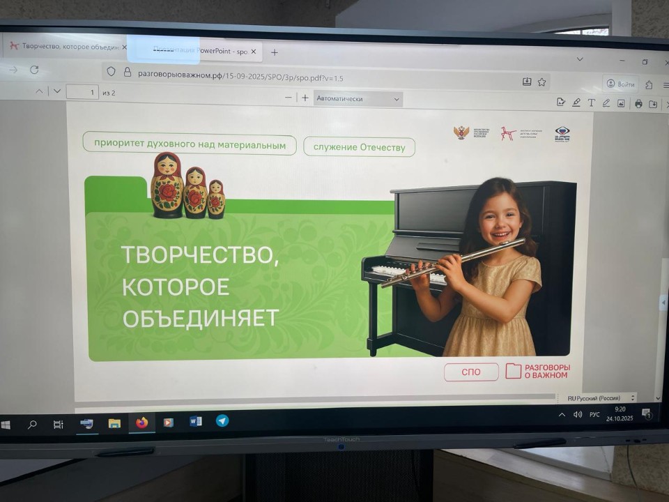15 сентября 2025 года со студентами первого курса направления Педагогическое образование, профиль Музыкальное образование были проведены Разговоры о важном, посвященные теме «Творчество, которое объединяет».