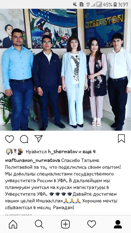 С 22 по 29 мая 2019 года состоялась рабочая поездка врио заведующей кафедрой музыкальных инструментов и музыкально-компьютерных технологий к.п.н., доцента Т.И. Политаевой в Кокандский государственный педагогический  институт им. Мукимий (г. Коканд, Узбекистан).
