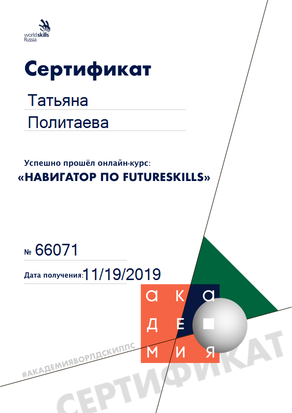 Заведующая кафедрой к.п.н., доцент Т.И. Политаева успешно прошла онлайн-курс "Навигатор по Future Skills".