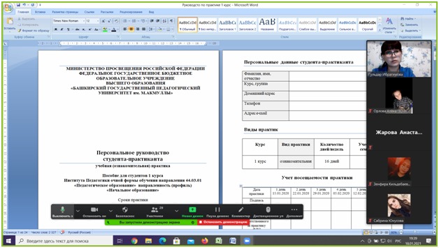 18 января 2021 г. руководителем практики к.п.н., старшим преподавателем кафедры ТиМНО ИП БГПУ им. М. Акмуллы Г.Ф. Ибрагимовой была проведена установочная конференция по ознакомительной практике для студентов 1 курса направления 44.03.01 "Педагогическое образование", профиль "Начальное образование" (очное отделение). Студенты получили информацию по заполнению отчетной документации, сроков прохождения практики (каждый четверг с 21.01.2021 г. по 06.05.2021 г.), деятельность студентов скоординирована в рамках проведения занятий в условиях текущей пандемии.