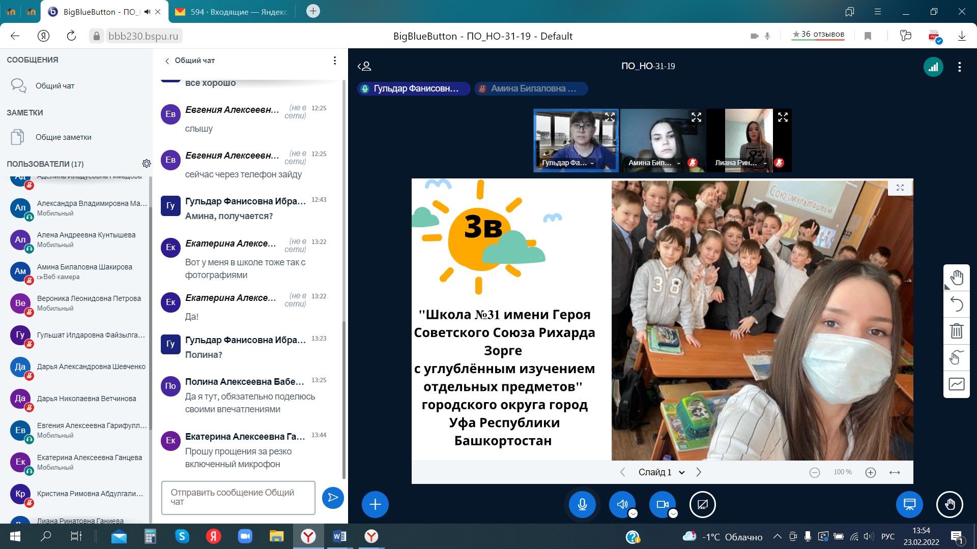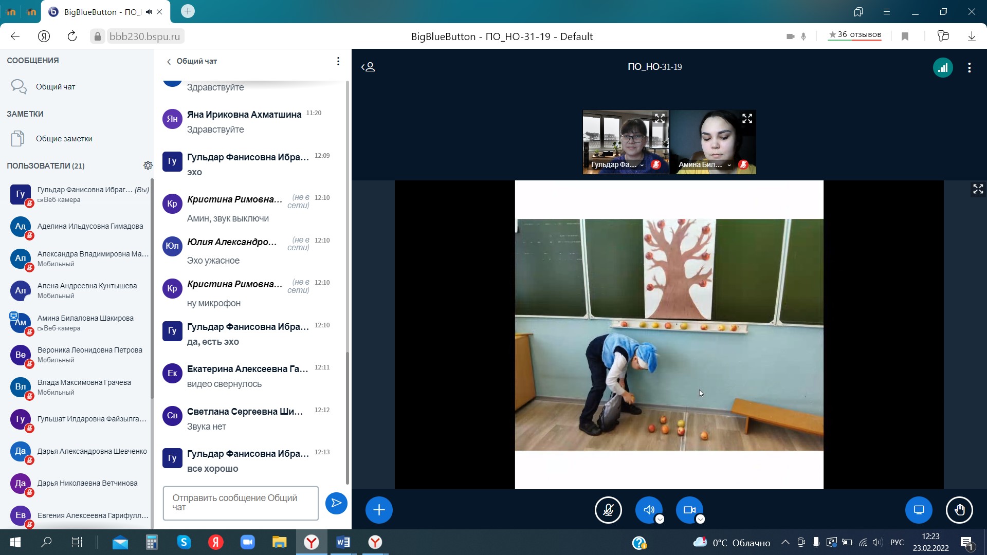 23 февраля 2022 г. прошла итоговая отчётная конференция по производственной педагогической (воспитательной) практике у студентов 3 курса направления 44.03.01 Педагогическое образование, профиль «Начальное образование» (руководитель практики – к.п.н., доц. кафедры ТиМНО Г.Ф. Ибрагимова). Согласно графику с 17.01.2022г по 22.02.2022г. студентами активно были пройдены дни практики: погружение в урочную и внеурочную деятельность, подготовка к школьным олимпиадам, участие в конкурсах, написание статьи по проблеме исследования, также анализ нормативно-правовой документации. Большинство студентов с удовольствием отзывались о пройденной практике, делились впечатлениями о своей подготовленности к будущей профессии.