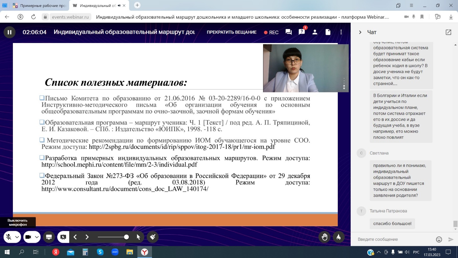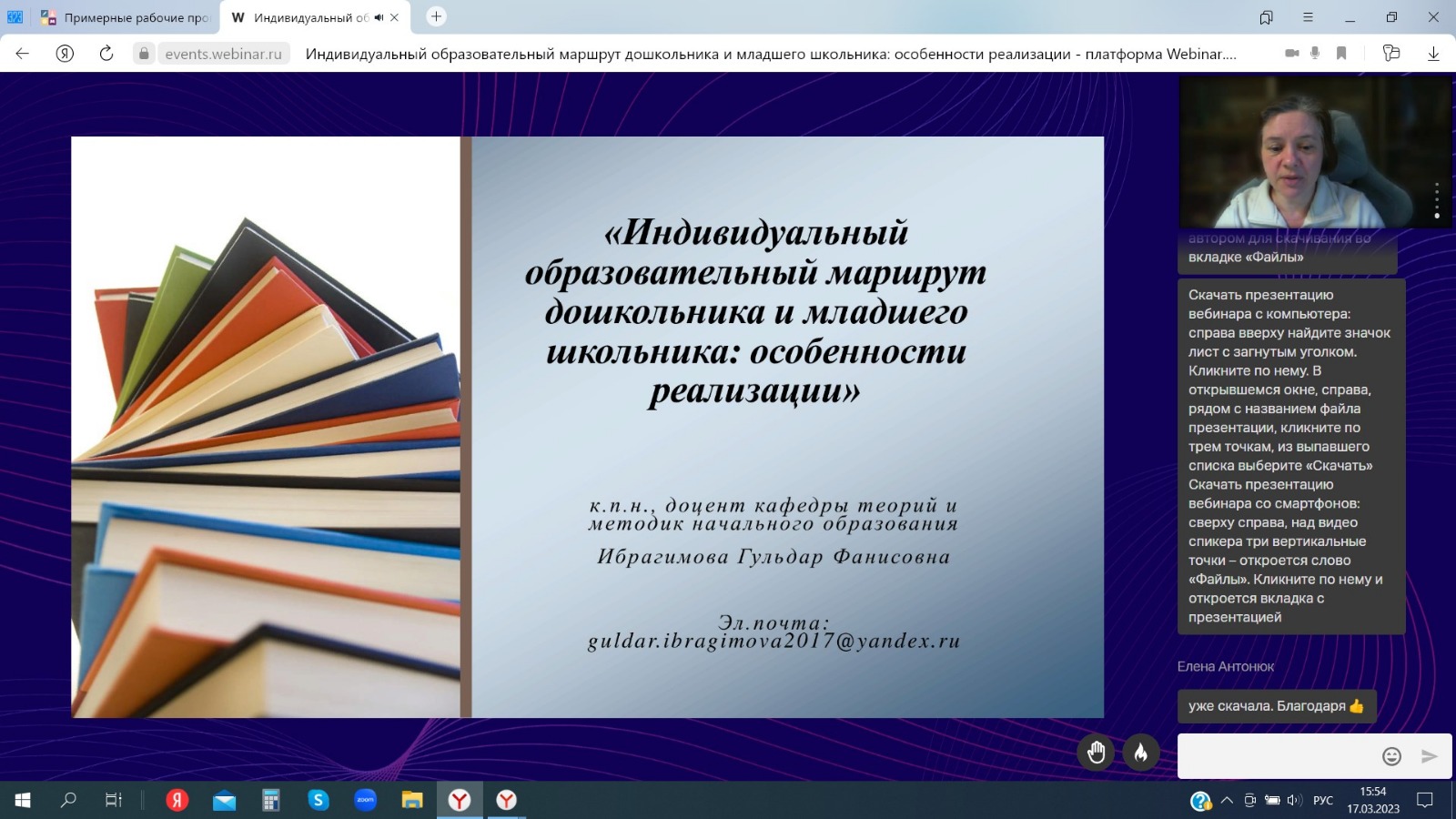 17 марта 2023 г. к.п.н., доцент кафедры теорий и методик начального образования Гульдар Фанисовна Ибрагимова провела вебинар по теме «Индивидуальный образовательный маршрут дошкольника и младшего школьника: особенности реализации». В ходе вебинара были раскрыты основные понятия в ракурсе нормативно-правовой документации, приведены примеры заполнения индивидуальных листов обучающихся.